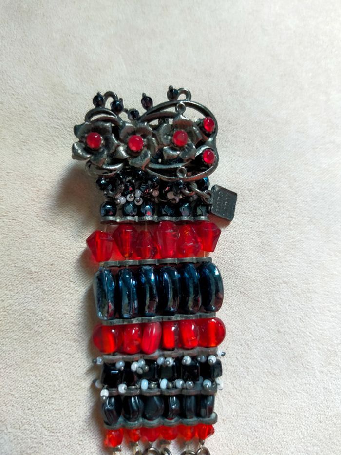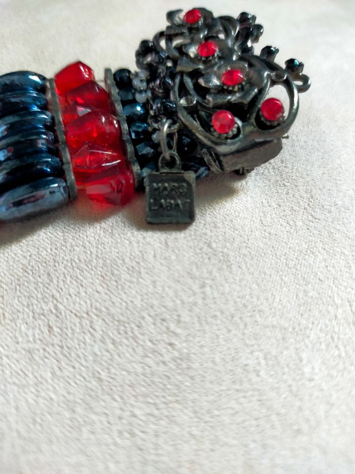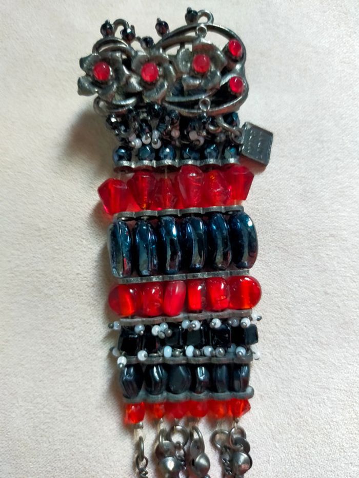 Broche signée Marc LABAT – Style baroque bohème noir et rouge avec pampilles - photo numéro 10