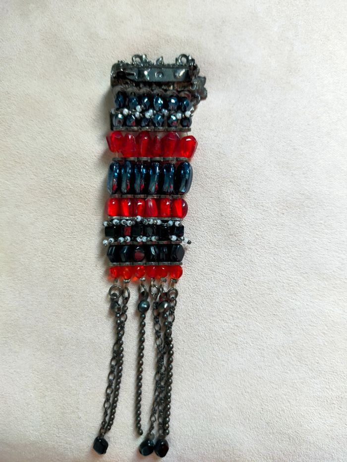 Broche signée Marc LABAT – Style baroque bohème noir et rouge avec pampilles - photo numéro 5