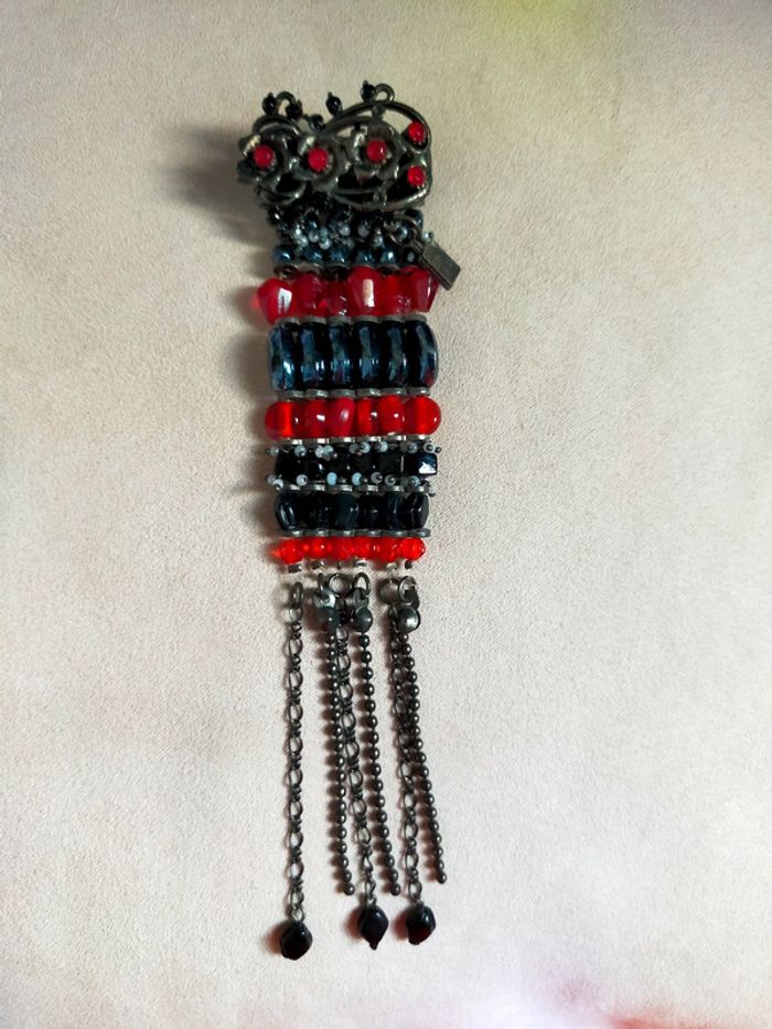 Broche signée Marc LABAT – Style baroque bohème noir et rouge avec pampilles - photo numéro 1