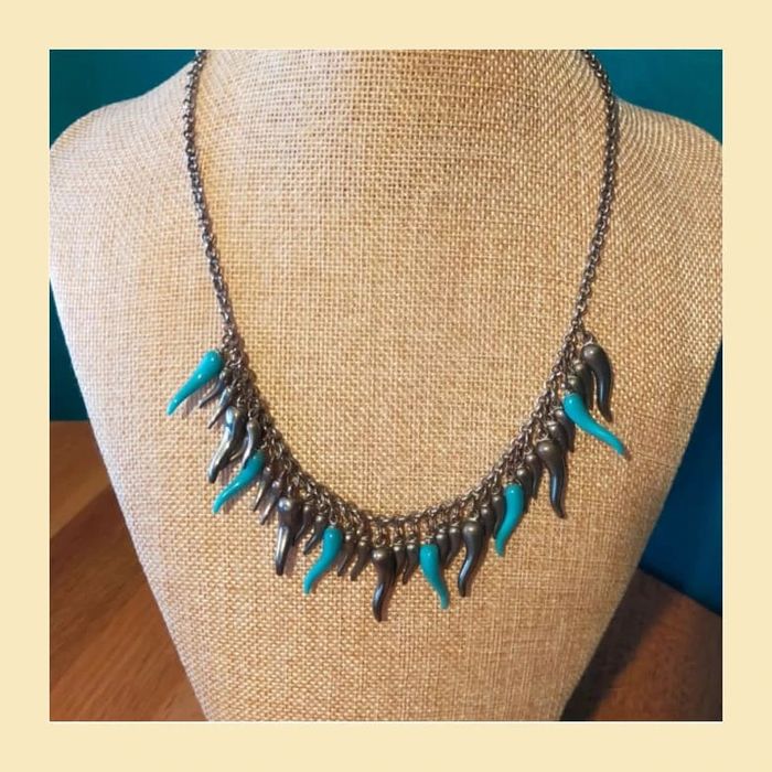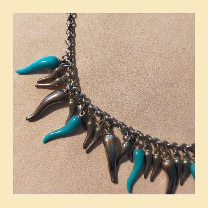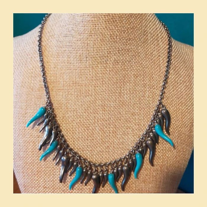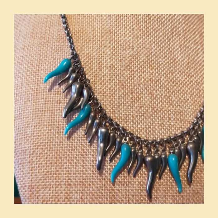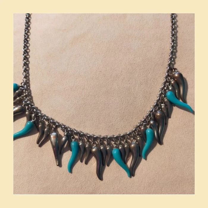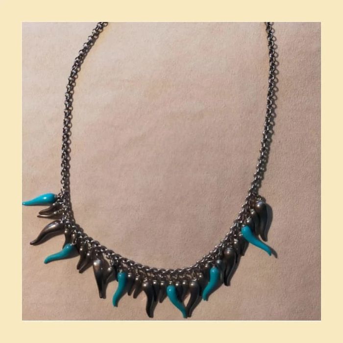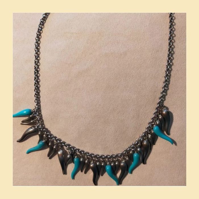 Collier court en chaîne argentée, orné de pampilles en forme de gouttes allongées, argentées et turquoise. Design original qui donne du peps à une tenue, parfait pour un look moderne ou bohème chic. Fermoir classique. En bon état. ✨ Léger, agréable à porter. LBIJ #collier #collierfantaisie #bijouxfemme #bijouxtendance #collierargenté #collierturquoise #collieroriginal #collierethnique #accessoirefemme #modevintage #bijouxvinted #colliergoutte #bijouxfantaisie
