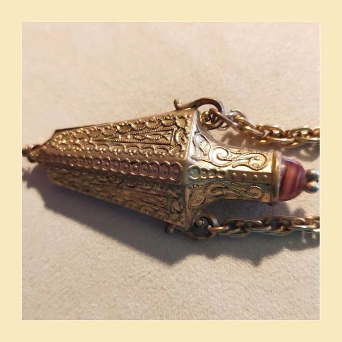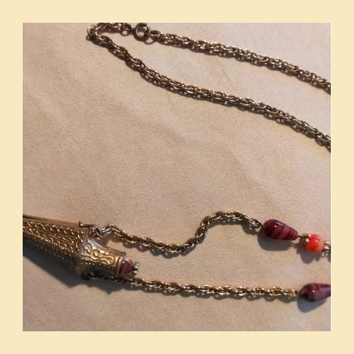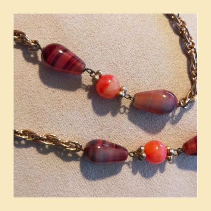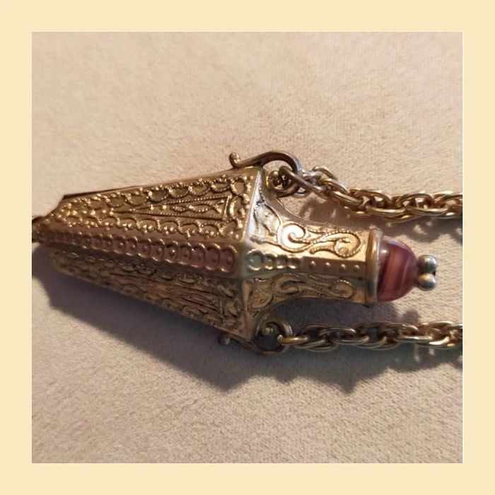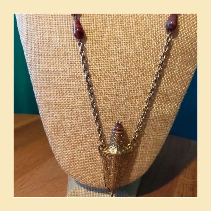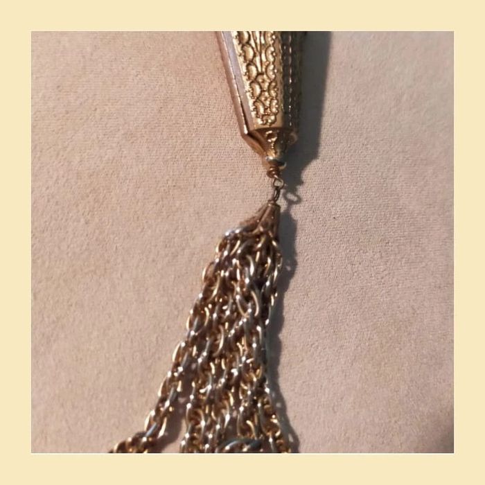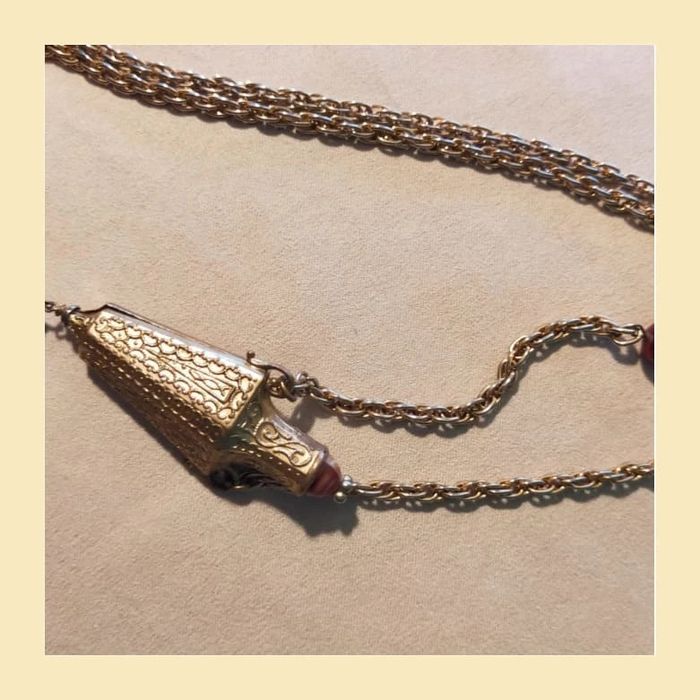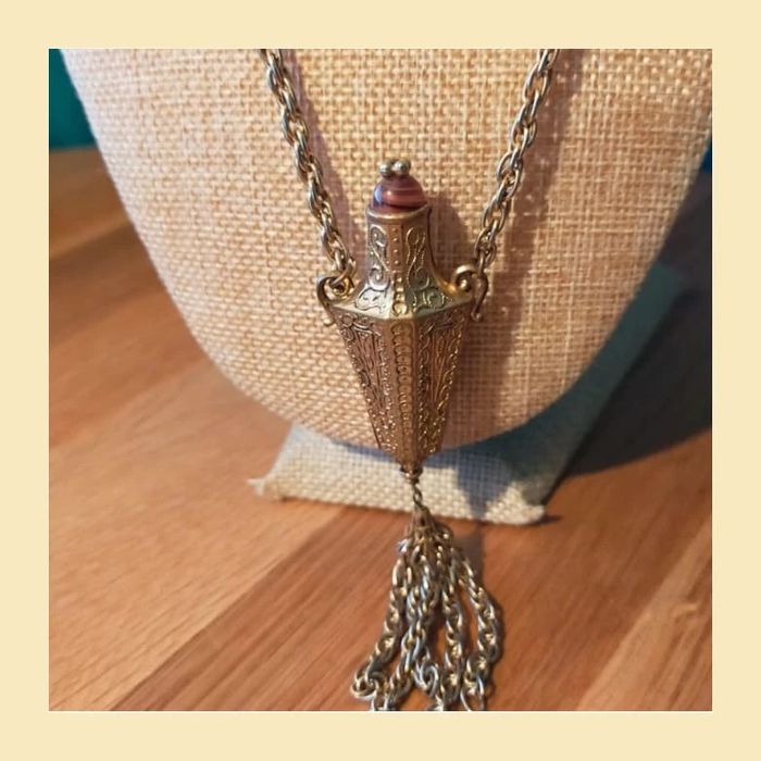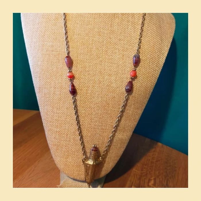 Collier ancien à chaîne dorée, orné de perles en forme de gouttes dans des tons orangé et brun. Le pendentif rappelle une amphore finement gravée, avec une perle décorative au sommet et des pampilles de chaînes en bas. Pas de marque visible. Pièce très originale, parfaite pour un look bohème, oriental ou vintage. ⚠️ Le pendentif ne s’ouvre pas. LBAN #colliervintage #bijouancien #collierfantaisie #bohemechic #bijouunique #collierdoré #styleoriental #bijouretro #vintagejewelry #longcollier #bijouxoriginaux #bijoucharme