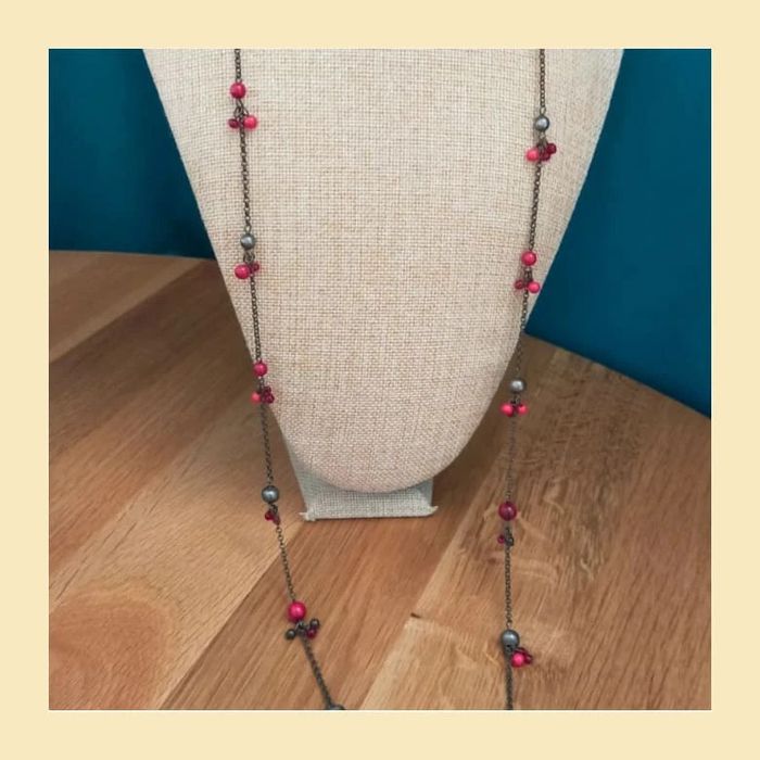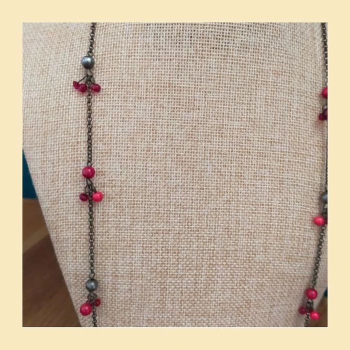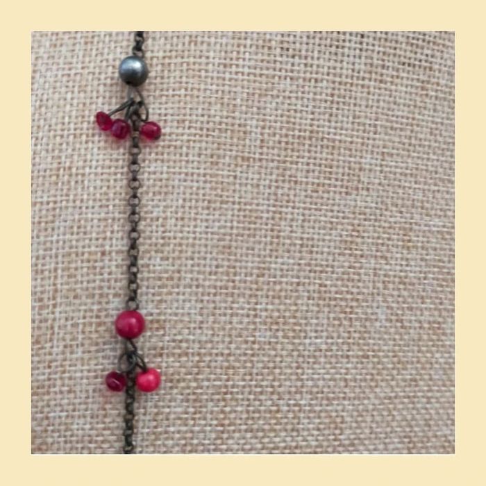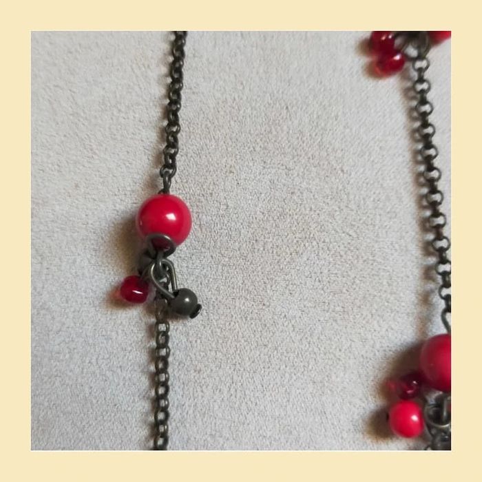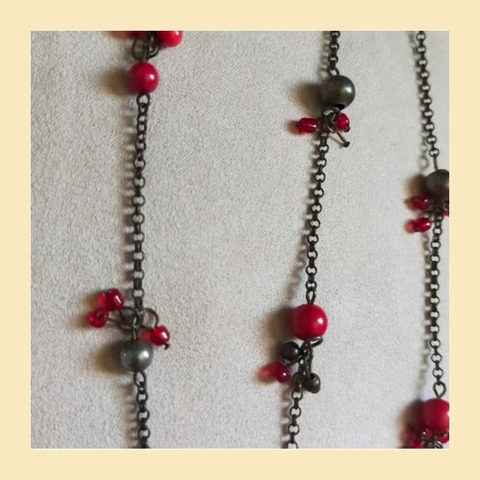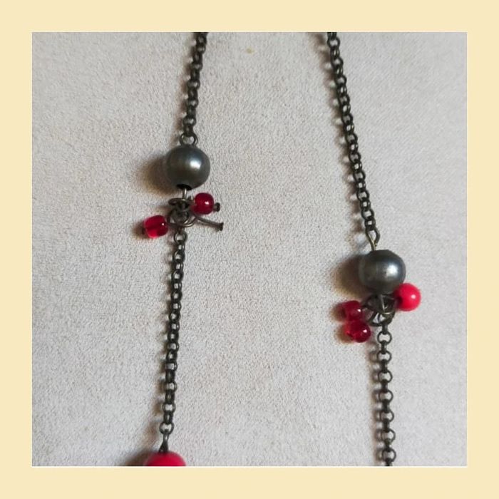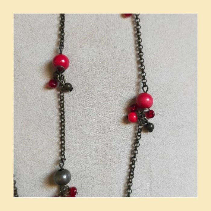 Collier vintage à chaîne couleur argent sombre, décoré de perles rouges translucides, rouges opaques et perles argentées de différentes tailles. 🔗 Fermoir mousqueton, facile à porter. 💫 Une pièce au charme discret, à la fois fin, élégant et délicatement coloré, parfaite pour habiller une tenue avec une touche subtile et raffinée. LBVIN #collier #colliervintage #perlesrouges #bijouxfemme #bijouxelegant #argenté #chic