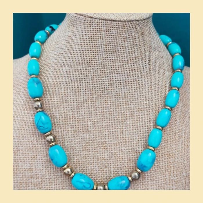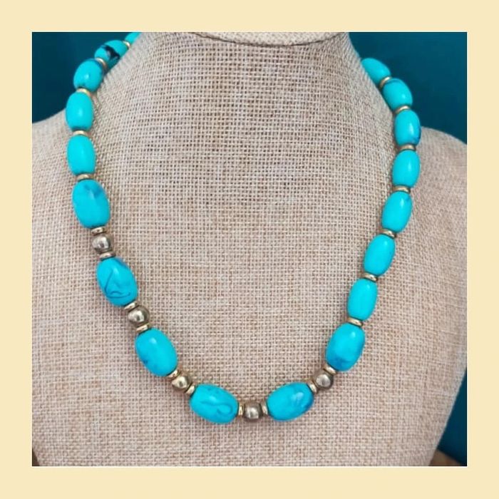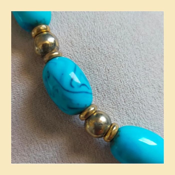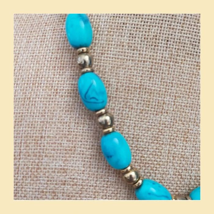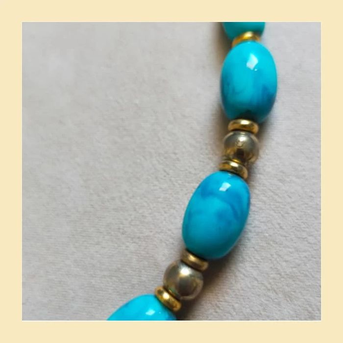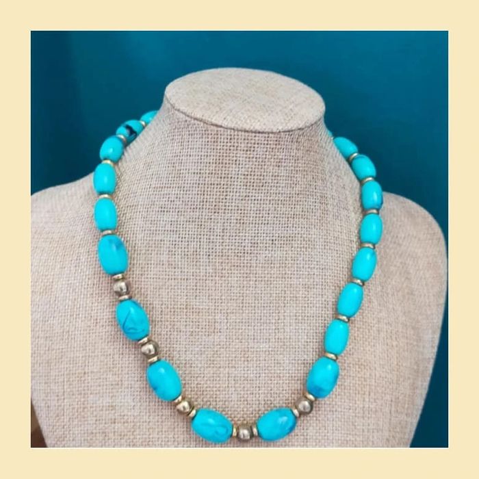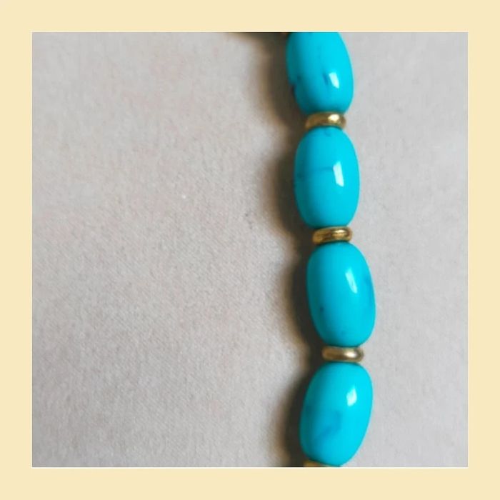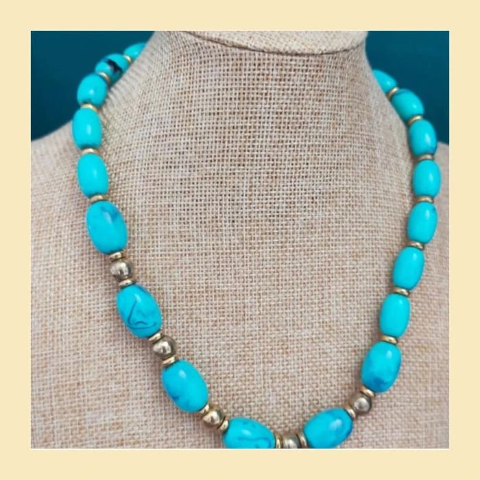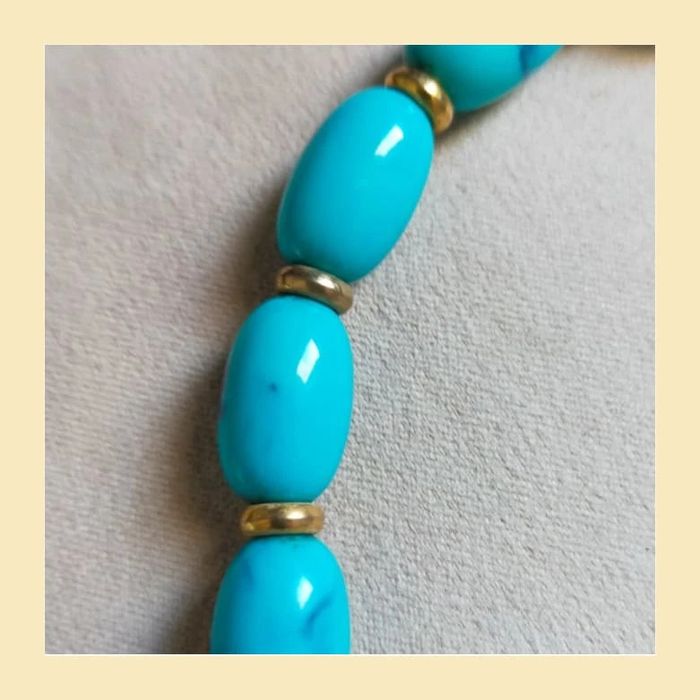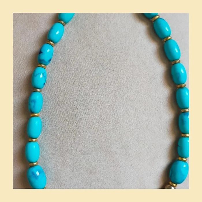 Magnifique collier vintage au style élégant et intemporel. ✨ Composé de pierres turquoise (probablement naturelles ou teintées), intercalées de perles dorées qui apportent lumière et raffinement à l’ensemble. 📏 Collier plutôt court, idéal pour sublimer un décolleté ou rehausser une tenue simple avec une touche chic et colorée. 💫 Un bijou lumineux, classe et raffiné, parfait pour les amatrices de pièces vintage uniques. LBVIN #collier #bijouxvintage #turquoise #elegant #bijouxfemme #stylechic #vintagelover