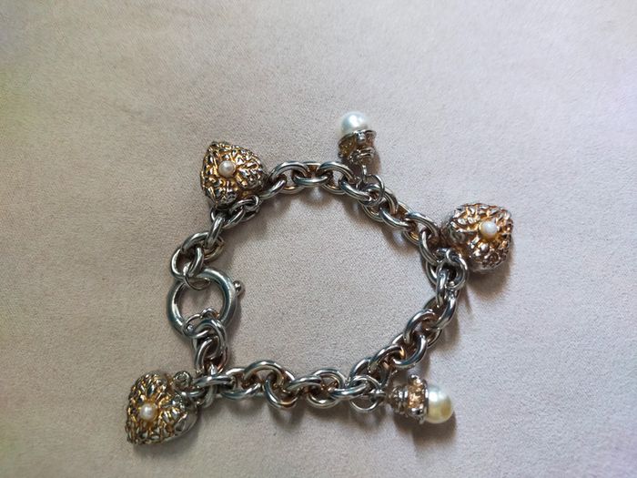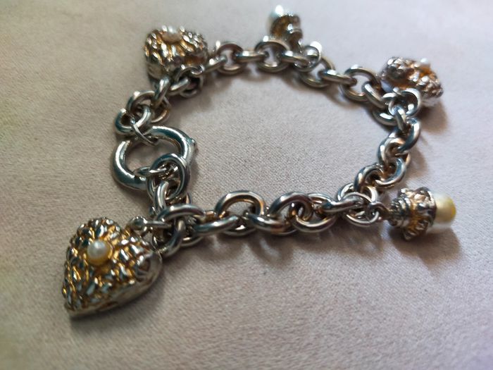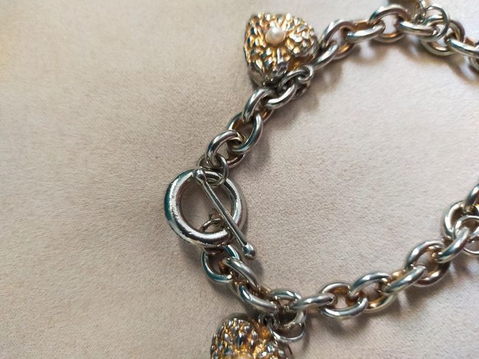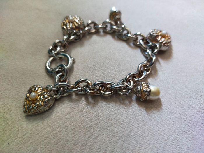 Bracelet chaîne argentée à charms vintage – Cœurs & perles nacrées - photo numéro 1