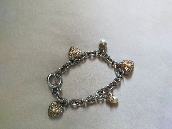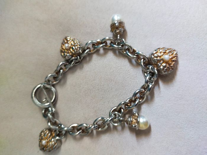 Bracelet élégant et original composé d’une chaîne argentée aux maillons larges, ornée de 5 breloques raffinées : – 2 cœurs ajourés dorés avec perles nacrées – 3 perles nacrées serties dans des montures dorées ciselées Fermoir à ressort circulaire, longueur totale : env. 20 cm. Style : romantique, rétro chic, idéal pour accessoiriser une tenue féminine. Matière : métal argenté et doré, perles fantaisie (nacrées, probablement en résine). Pièce de caractère avec un charme intemporel 💕 📦 Très bon état. 💌 Je soigne l’envoi & l’emballage. Envoi rapide. 🎁 Possibilité d’envoi en lot ou d’ajouter un petit cadeau surprise en cas de plusieurs achats ! BOIVIN Hashtags : #braceletcharms #braceletvintage #bijouxfantaisie #coeur #perlesnacrées #stylechic #lookromantique #bijourétro #cadeau