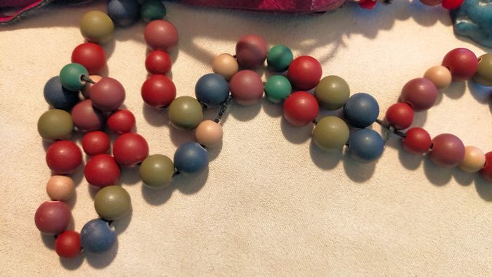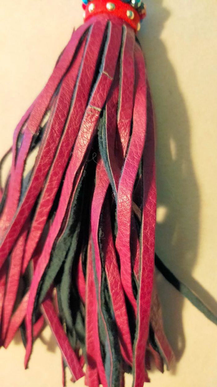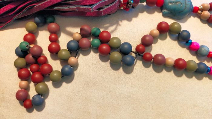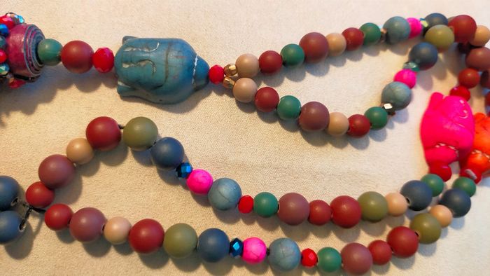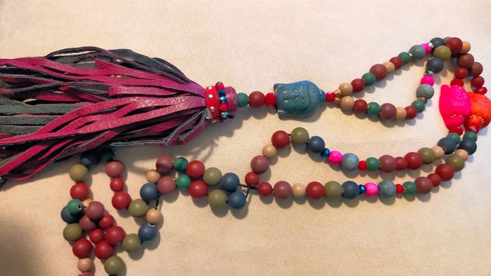 Superbe collier long au style bohème ethnique, composé de perles mates multicolores (matière synthétique type polymère), de deux têtes sculptées au toucher froid et lourd (probablement en pierre reconstituée ou en pierre naturelle teintée), d’éléments textiles et de deux petits Bouddhas roses en tissu. Le pendentif est un grand pompon en lanières de cuir ou simili cuir souple (rose et noir avec traces d'usure par endroits), décoré d’un anneau de strass et de perles fantaisie. L'ensemble forme un bijou audacieux, à la fois original et artisanal, parfait pour apporter une touche colorée à vos tenues. Détails techniques : Longueur totale : environ 80 cm Fermeture : sans (collier à enfiler) Couleurs dominantes : multicolore (rouge, bordeaux, bleu, vert, beige, rose…) Matières : perles synthétiques, pierres sculptées (?), cuir ou simili cuir, tissu Style : bohème, ethnique, artisanal État : Bon état Collection : Terres d’Ailleurs Pièce unique : Oui 💌 Je soigne l’envoi & l’emballage. Envoi rapide. 🎁 Possibilité d’envoi en lot ou d’ajouter un petit cadeau surprise en cas de plusieurs achats ! L1R #collier #collierlong #bijouethnique #bijoubohème #collierbohème #styleethnique #bijouartisanal #bijouoriginal #accessoirefemme #collierfantaisie #faitmain #couleurschaudes #perlescolorées #tetesculptée #pierreteintée #cuir #pompon #terresdailleurs #boho #bohostyle