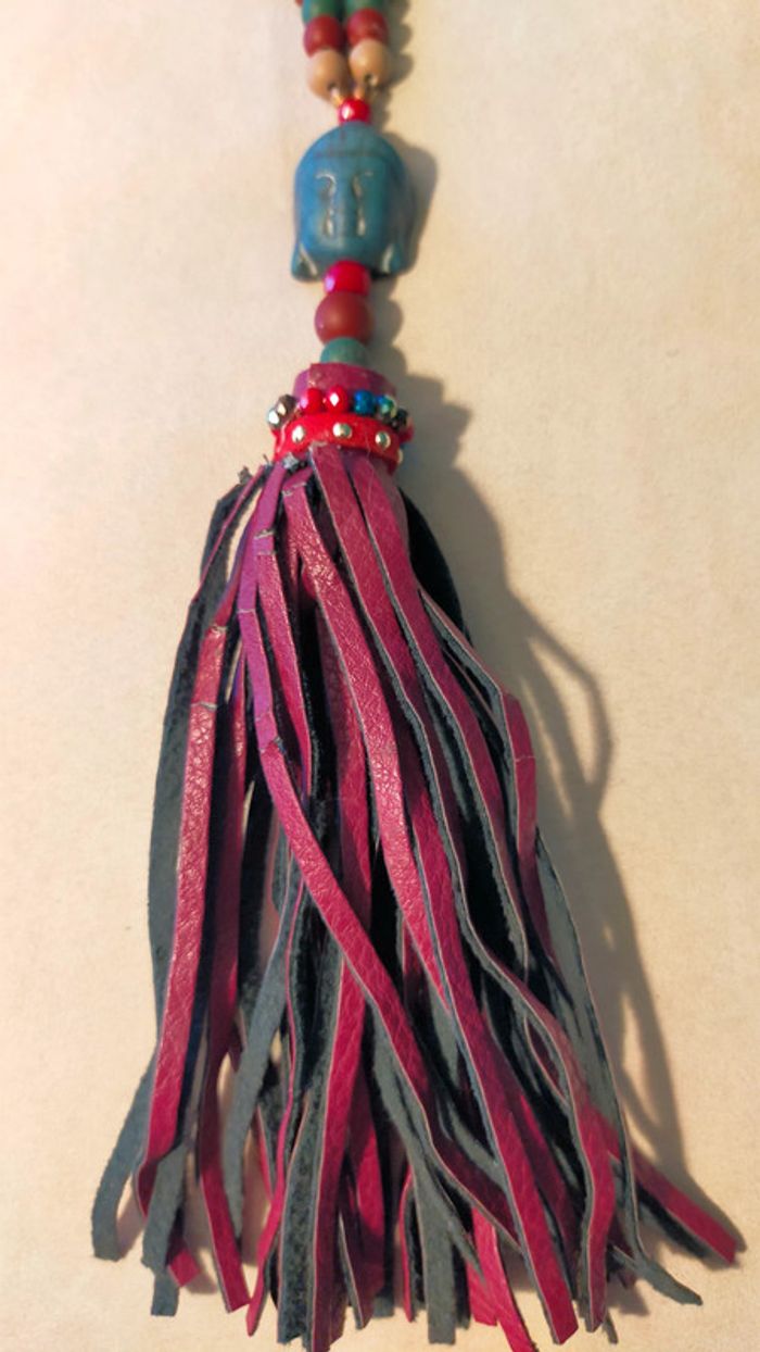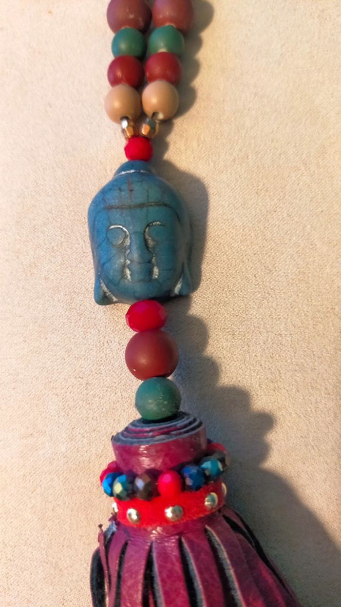 Collier long bohème ethnique – Têtes sculptées, perles mates et pompon cuir – Terres d’Ailleurs - photo numéro 3