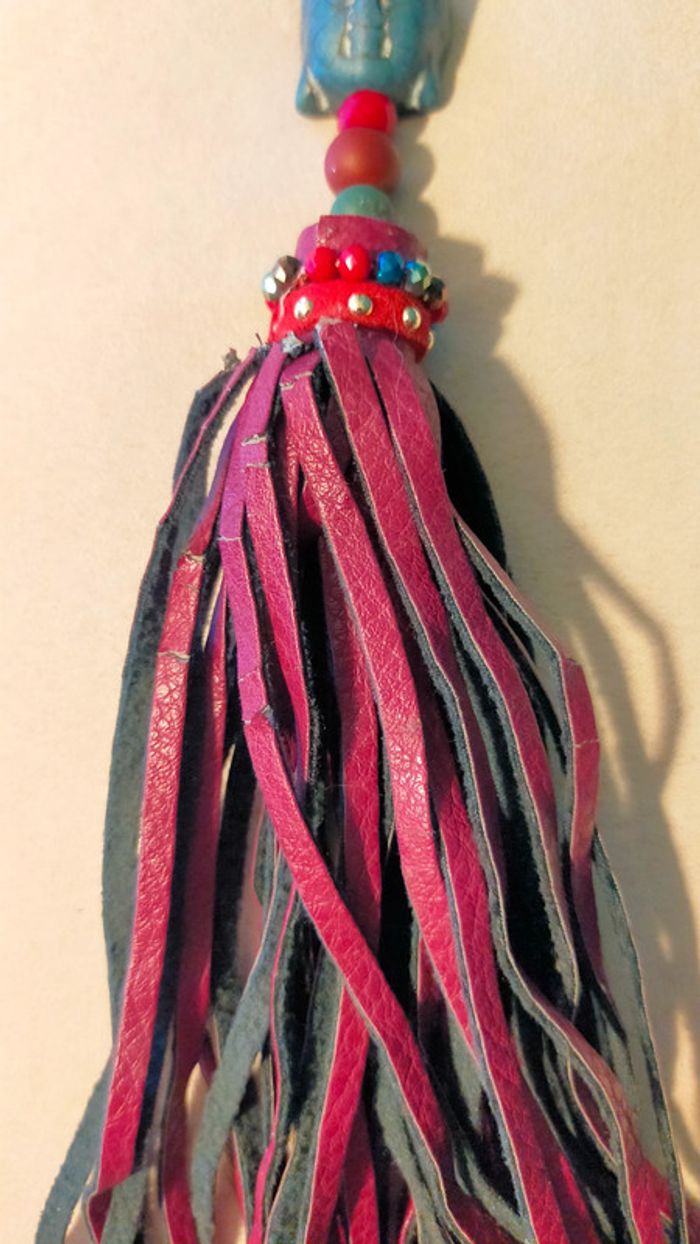 Collier long bohème ethnique – Têtes sculptées, perles mates et pompon cuir – Terres d’Ailleurs - photo numéro 13