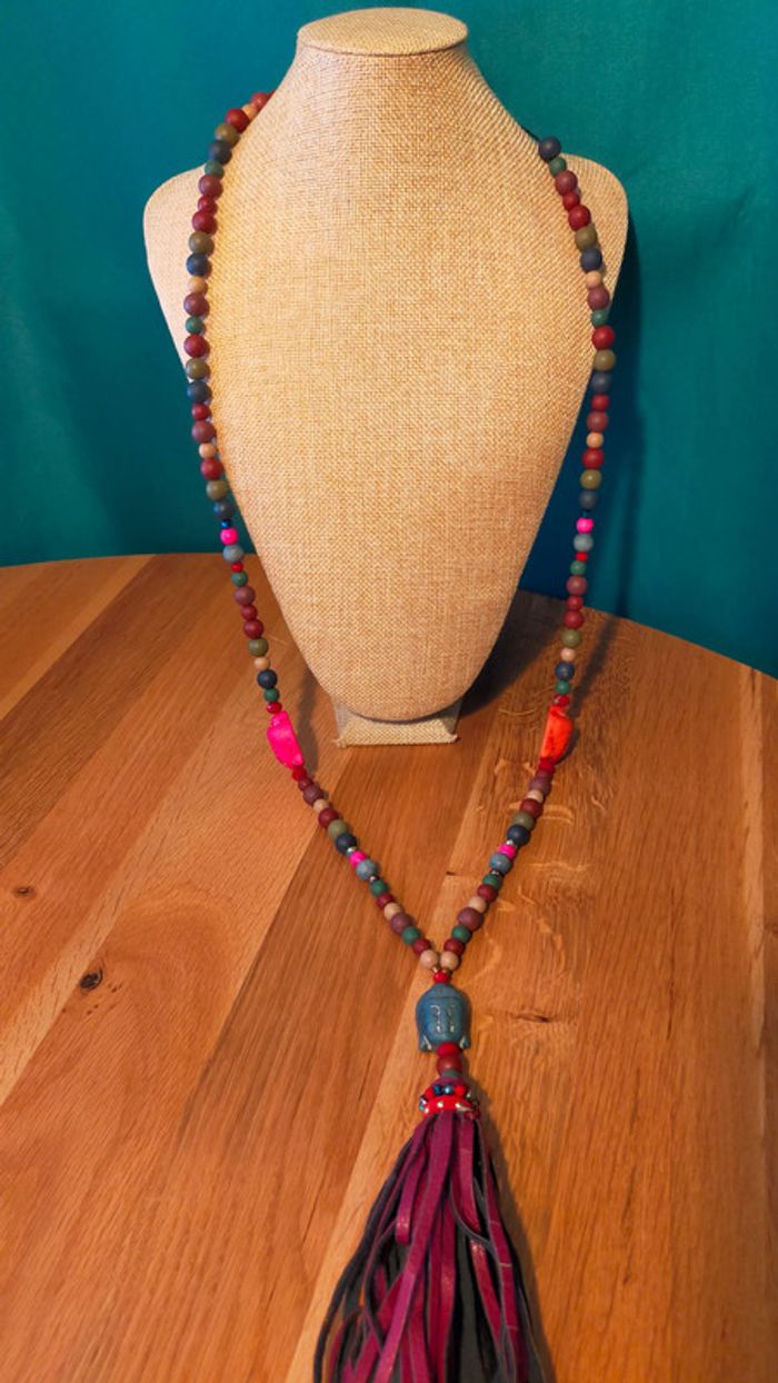 Collier long bohème ethnique – Têtes sculptées, perles mates et pompon cuir – Terres d’Ailleurs - photo numéro 1