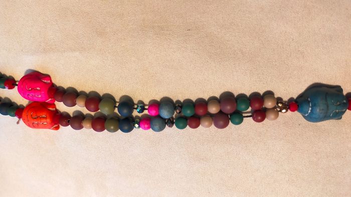 Collier long bohème ethnique – Têtes sculptées, perles mates et pompon cuir – Terres d’Ailleurs - photo numéro 4