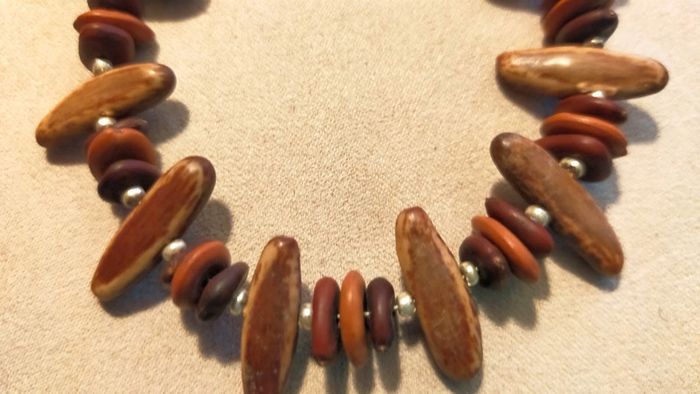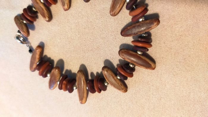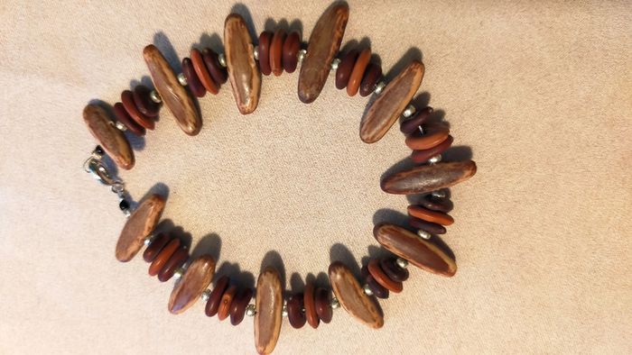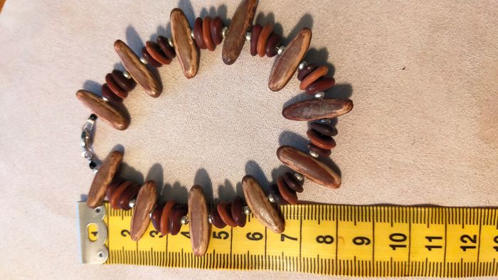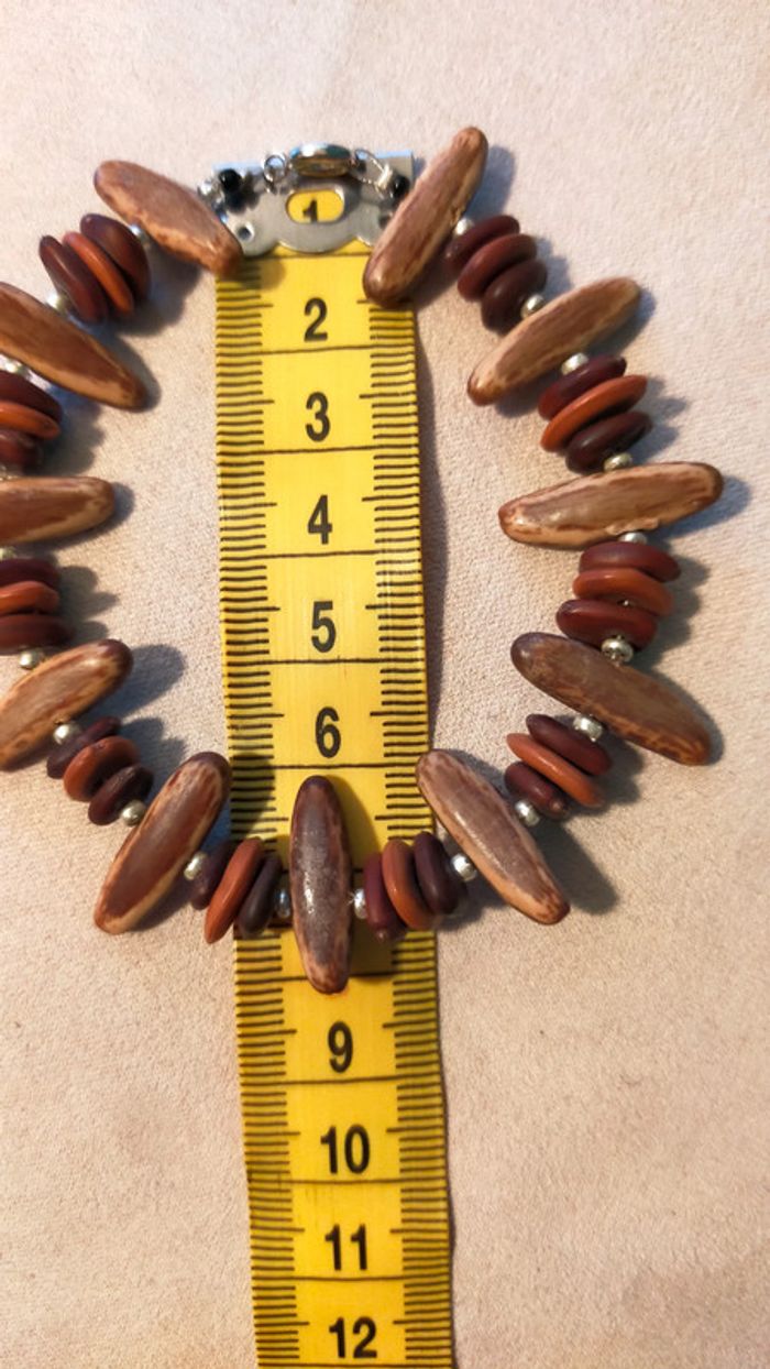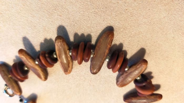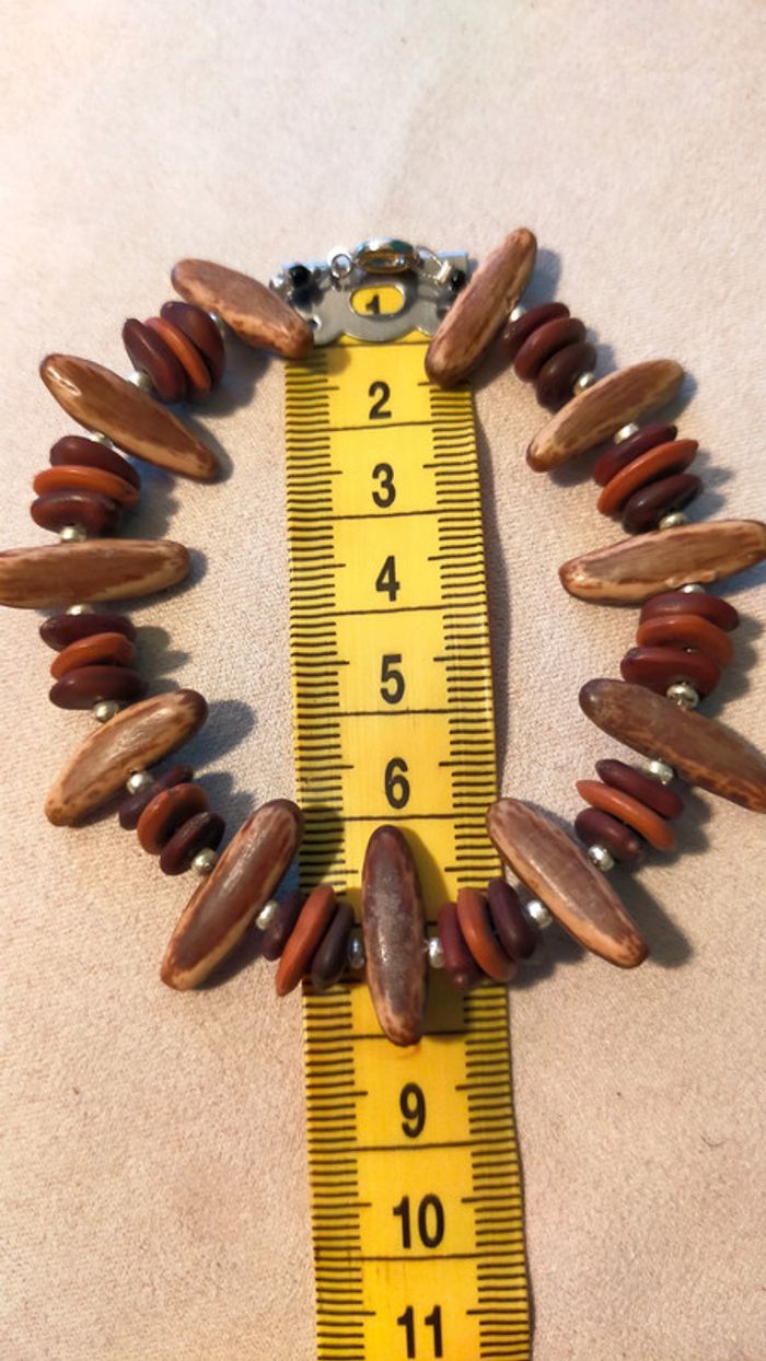 Bracelet unique composé d’éléments naturels aux teintes chaudes, parfait pour un style ethnique et authentique. Les longues perles marron clair à nervures sont probablement en graine ou noix tropicale polie. Les perles rondes superposées sont en bois teinté dans des tons brique, acajou et brun foncé. Les petites perles métalliques argentées apportent une touche d’éclat. Fermoir mousqueton argenté solide. Longueur totale : environ 20 cm. 🔸 Matières estimées : graine polie (type palmier tagua ou coco), bois teinté, métal argenté. 🔸 Style : ethnique, artisanal, nature, authentique. 🔸 État : très bon état général, quelques traces discrètes visibles sur une perle (voir photos). 📍 Collection : Terres d’Ailleurs 💌 Je soigne l’envoi & l’emballage. Envoi rapide. 🎁 Possibilité d’envoi en lot ou d’ajouter un petit cadeau surprise en cas de plusieurs achats ! L1R #bracelet #terresdailleurs #bois #ethnique #naturel #artisanal #faitmain #bijouauthentique