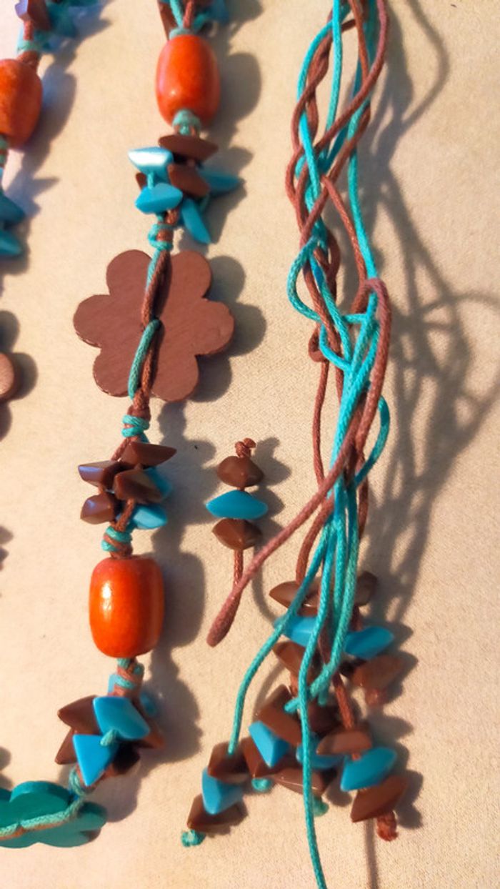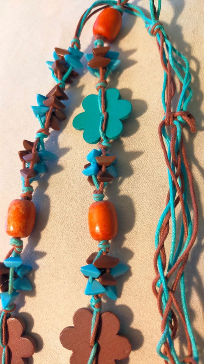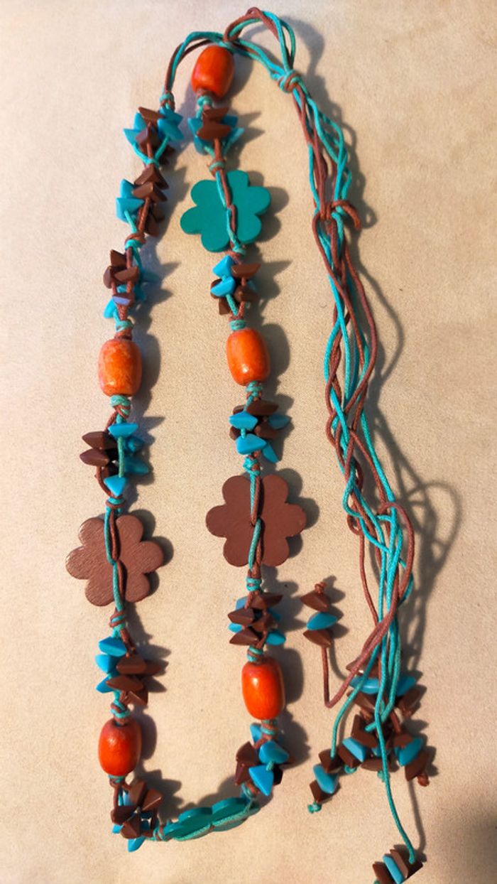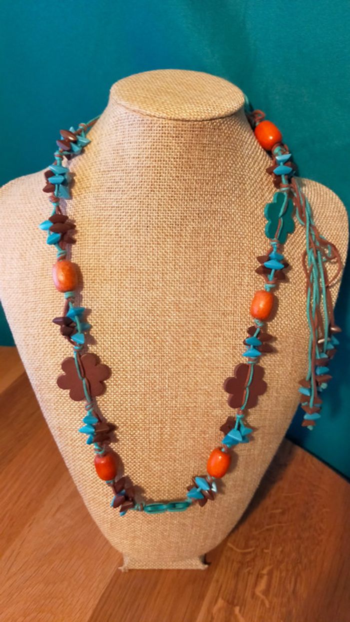 Plongez dans l’univers chaleureux de la collection Terres d’Ailleurs avec ce collier fait main au charme artisanal. Composé de fleurs plates en polymère couleur chocolat, de perles turquoise et brunes en résine, et de perles en bois teinté rouge orangé, ce bijou joue sur les contrastes de matière et de couleurs naturelles. Le montage sur cordon coton tressé lui apporte une touche authentique et douce. État : Très bon état Marque : Fantaisie artisanale Couleurs : Marron, turquoise, rouge orangé Matériaux : – Fleurs en pâte polymère (aspect bois peint) – Perles en résine (turquoise et marron) – Perles centrales en bois teinté – Cordon en coton ciré (turquoise et brun) Style : Bohème – Ethnique – Naturel – Original Fermeture : Nœud ajustable à glisser Longueur : Ajustable, collier long (sautoir) Pièce unique. Idéal pour une tenue bohème, ethnique ou estivale. Léger, coloré, et plein de caractère ! L1R #collierfantaisie #collierethnique #bijouxbohème #faitmain #bijouxdailleurs #perlesbois #terresdailleurs #colliercoloré #sautoir #colliernaturel #bijouxartisanaux #polymère