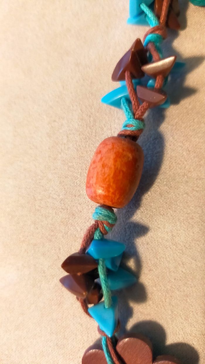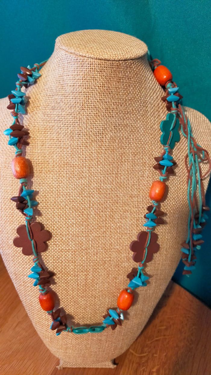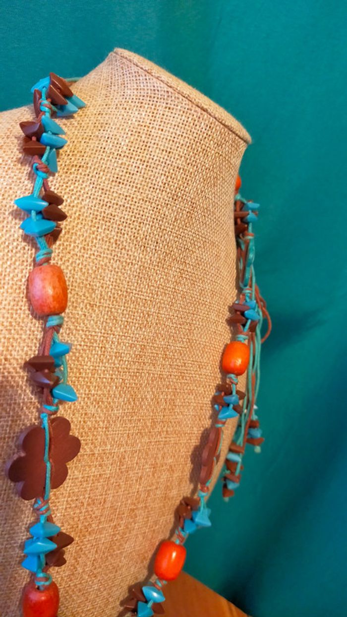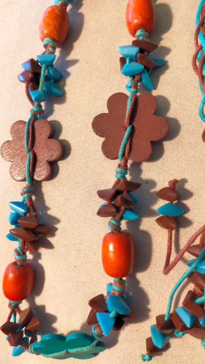 Plongez dans l’univers chaleureux de la collection Terres d’Ailleurs avec ce collier fait main au charme artisanal. Composé de fleurs plates en polymère couleur chocolat, de perles turquoise et brunes en résine, et de perles en bois teinté rouge orangé, ce bijou joue sur les contrastes de matière et de couleurs naturelles. Le montage sur cordon coton tressé lui apporte une touche authentique et douce. État : Très bon état Marque : Fantaisie artisanale Couleurs : Marron, turquoise, rouge orangé Matériaux : – Fleurs en pâte polymère (aspect bois peint) – Perles en résine (turquoise et marron) – Perles centrales en bois teinté – Cordon en coton ciré (turquoise et brun) Style : Bohème – Ethnique – Naturel – Original Fermeture : Nœud ajustable à glisser Longueur : Ajustable, collier long (sautoir) Pièce unique. Idéal pour une tenue bohème, ethnique ou estivale. Léger, coloré, et plein de caractère ! L1R #collierfantaisie #collierethnique #bijouxbohème #faitmain #bijouxdailleurs #perlesbois #terresdailleurs #colliercoloré #sautoir #colliernaturel #bijouxartisanaux #polymère