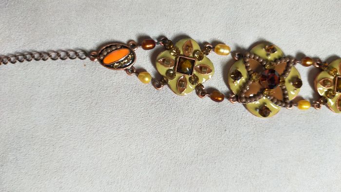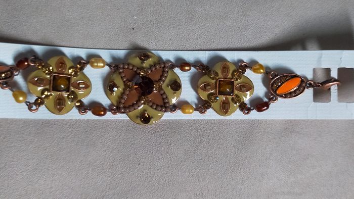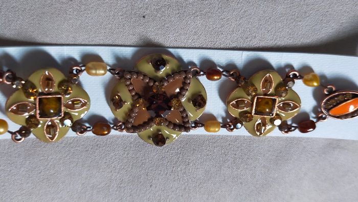 Bracelet élégant à motifs floraux et géométriques, dans des tons chauds d’ambre, de cuivre et de vert olive. Composé de maillons ornés de cabochons, de perles facettées et de détails émaillés. Un bijou fort en caractère, inspiré des bijoux ethniques et orientaux. 💡 Idéal pour accompagner une tenue bohème ou apporter une touche sophistiquée et lumineuse à un look sobre. 📏 Longueur : environ 19 cm 🎨 Couleurs : ambre, bronze, vert olive, or cuivré 🧵 Matières : métal cuivré, émail, perles de verre et résine ✨ Fermoir : à mousqueton 📌 Collection : Sable & Ébène 📦 État : Très bon état 🎁 Possibilité d’envoi en lot ou d’ajouter un petit cadeau surprise en cas de plusieurs achats ! 💌 Je soigne l’envoi & l’emballage. Envoi rapide. L5R #bracelet #bijouethnique #oriental #ambre #bijouxfantaisie #sableetébène #cuivré #braceletfemme #bohème #perles #émaillé