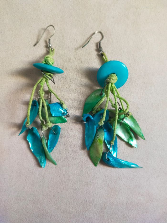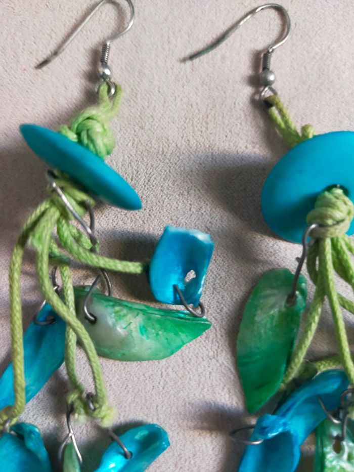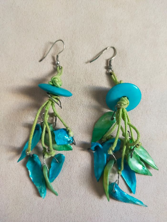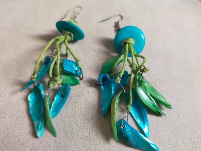 Pièces originales et aériennes, ces longues boucles sont composées de brins de fil vert d'où pendent des éléments en nacre teintée bleue et verte, aux reflets irisés. Le disque central turquoise leur donne un ancrage visuel fort. Elles évoquent des feuilles dansantes ou des pétales tropicales. 🔸 Matières estimées : Nacre teintée bleue/verte (éléments pendants) Disques turquoise en bois ou nacre épaisse teintée Cordon en fil coton vert Attaches en métal fantaisie 🔸 Style : Ethnique & nature Léger, coloré et organique Influence artisanat du monde 🔸 Attaches : crochets classiques 🔸 Longueur totale : env. 9 cm 🔸 État : Bon état général mais un éclat ou fêle visible sur une breloque de chaque boucle (voir photos). Cela reste discret une fois porté. 📌 Collection : Terres d’Ailleurs Des créations vibrantes inspirées par la nature, les matières du monde et l’artisanat d’ailleurs. 💌 Je soigne l’envoi & l’emballage. Envoi rapide. 🎁 Possibilité d’envoi en lot ou d’ajouter un petit cadeau surprise en cas de plusieurs achats ! LBO1 #BouclesDOreilles #Turquoise #Vert #NacreTeintée #StyleEthnique #BijouxArtisanaux #BijouxFantaisie #TerresDAilleurs #Longues