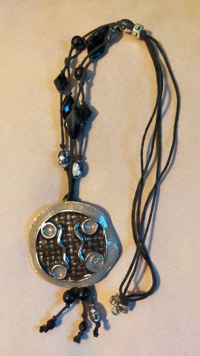 Collier long au style bohème/ethnique, composé de : Cordon textile noir tressé Perles fantaisie en verre noir, gris fumé et marbré Médaillon en métal argenté et motif tressé noir (avec détails en relief spirales et perles nacrées) Bijou original et léger, idéal pour sublimer une tenue simple ou donner une touche tribale chic. 💬 Détails : • Matières : Verre, métal argenté, corde textile noire • État : Très bon état • Couleurs : Noir, gris, argenté 🎀 Collection : Terres d’Ailleurs 💌 Je soigne l’envoi & l’emballage. Envoi rapide. 🎁 Possibilité d’envoi en lot ou d’ajouter un petit cadeau surprise en cas de plusieurs achats ! L8R #collier #bijouxfemme #bijouxvintage #ethnique #boheme #noir #argenté #bijouxfantaisie #terresdailleurs #accessoires