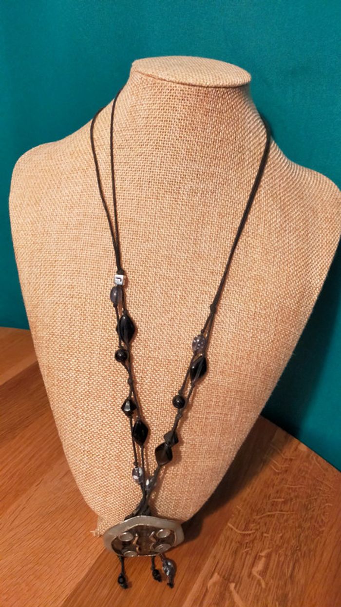 Collier long médaillon ethnique noir et argent – Collection Terres d’Ailleurs - photo numéro 2