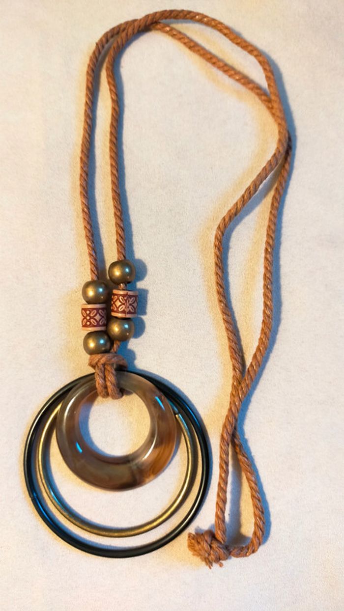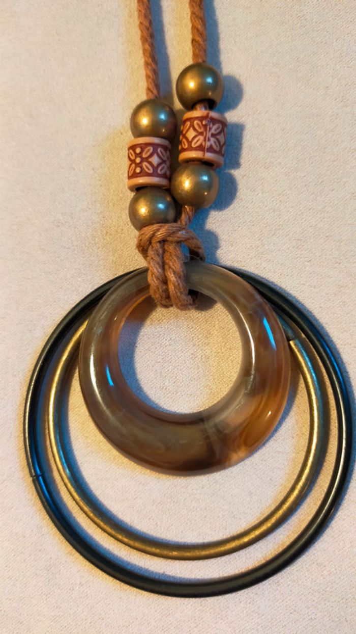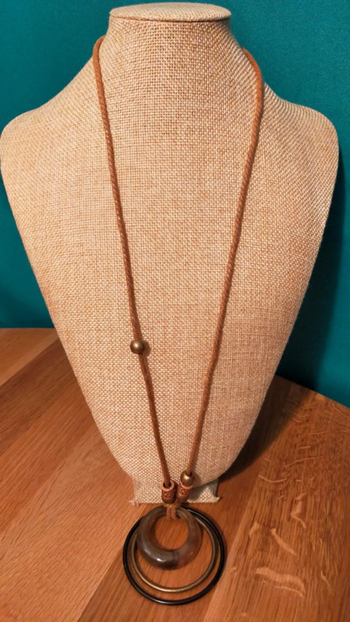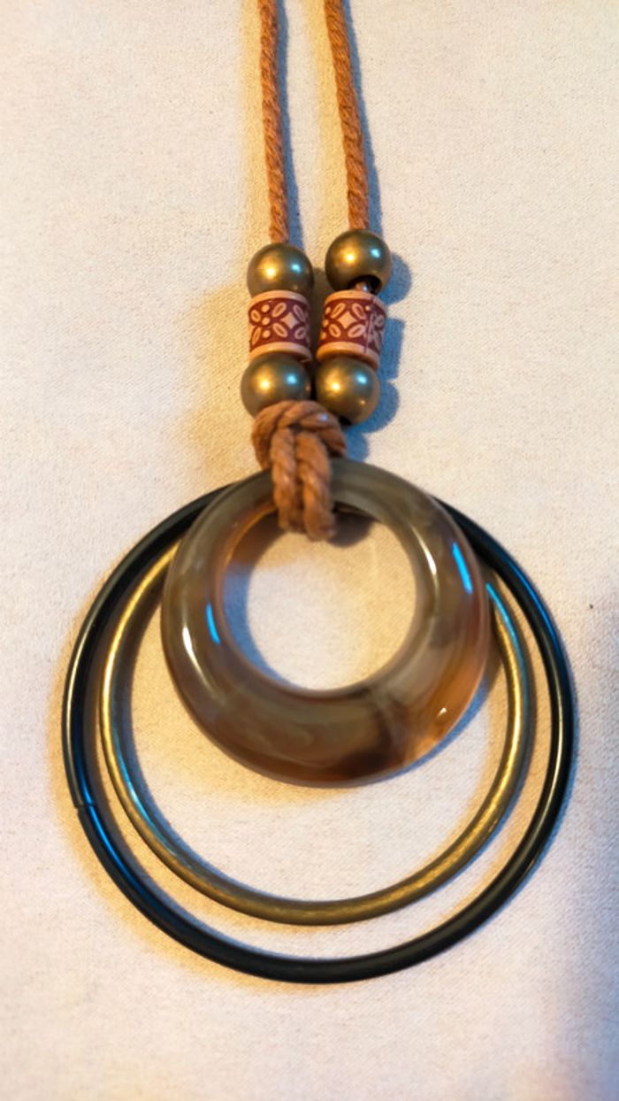 Collier long au style artisanal et exotique, composé de : Cordon tressé couleur camel Anneaux en résine effet marbré beige et brun Anneaux métalliques bronze et noir Perles en bois décorées de motifs ethniques Un bijou léger, parfait pour un style bohème, naturel et chaleureux. 💬 Détails : • Matières : Résine, bois, métal, corde textile • État : Très bon état • Couleurs : Camel, beige, brun, bronze, noir 🎀 Collection : Terres d’Ailleurs 💌 Je soigne l’envoi & l’emballage. Envoi rapide. 🎁 Possibilité d’envoi en lot ou d’ajouter un petit cadeau surprise en cas de plusieurs achats ! L8R #collier #bijouxfemme #boheme #ethnique #accessoires #bijouxnaturels #terresdailleurs #bijouxbois #vintage #exotique