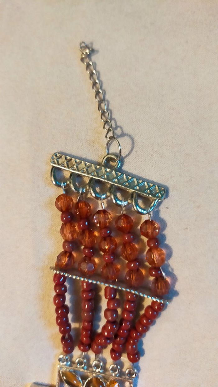 Bracelet vintage original, composé de : Bracelet en métal argenté serti de cabochons en résine effet œil de tigre (marron doré) Strass ronds jaune ambré Petites perles rouges en résine Rangées de perles rouges en verre Structure élastiquée pour un port confortable Pièce unique au style ethnique et bohème affirmé. 💬 Détails : • Matières : Métal argenté, résine, strass, perles de verre • État : Bon état général (⚡ quelques petites perles manquantes au centre, visible sur photo) • Couleurs : Rouge, ambre, marron doré, argenté 🎀 Collection : Sable & Ébène 💌 Je soigne l’envoi & l’emballage. Envoi rapide. 🎁 Possibilité d’envoi en lot ou d’ajouter un petit cadeau surprise en cas de plusieurs achats ! L5V #bracelet #bijouxfemme #bijouxvintage #vintage #boheme #ethnique #bijouxoriginaux #sableetebene #accessoires