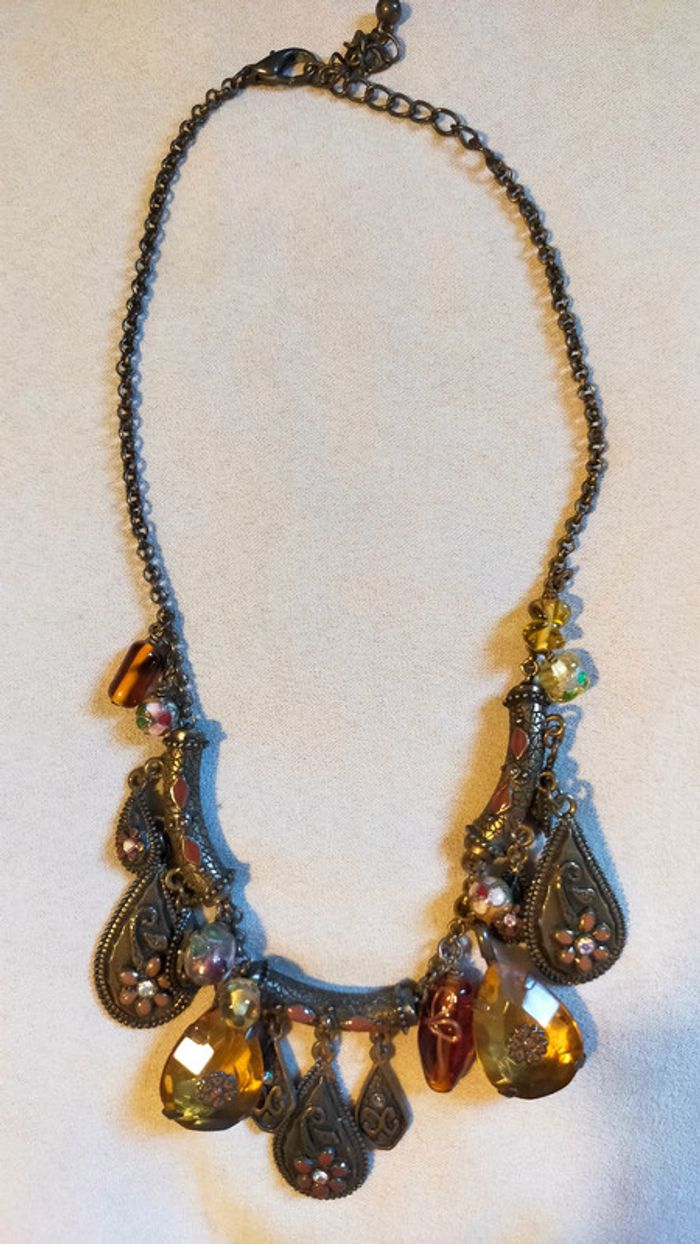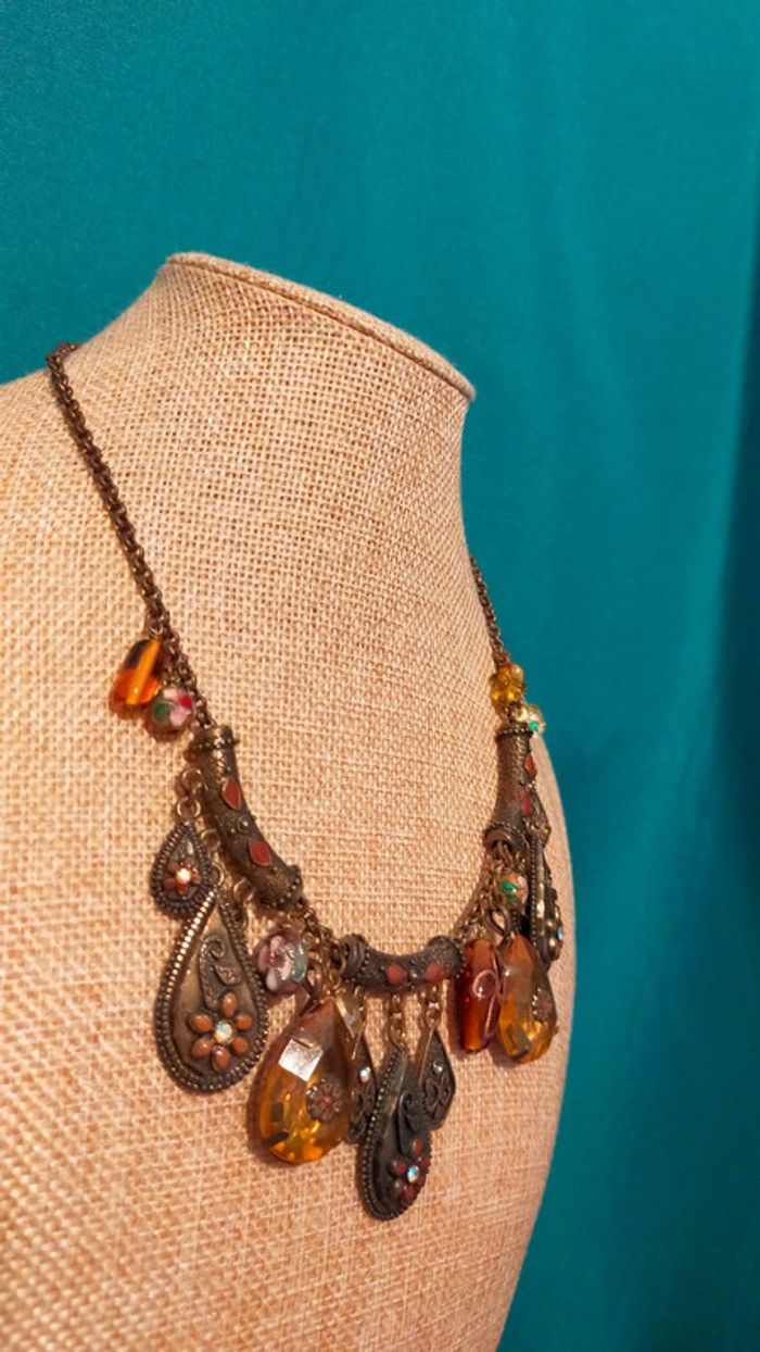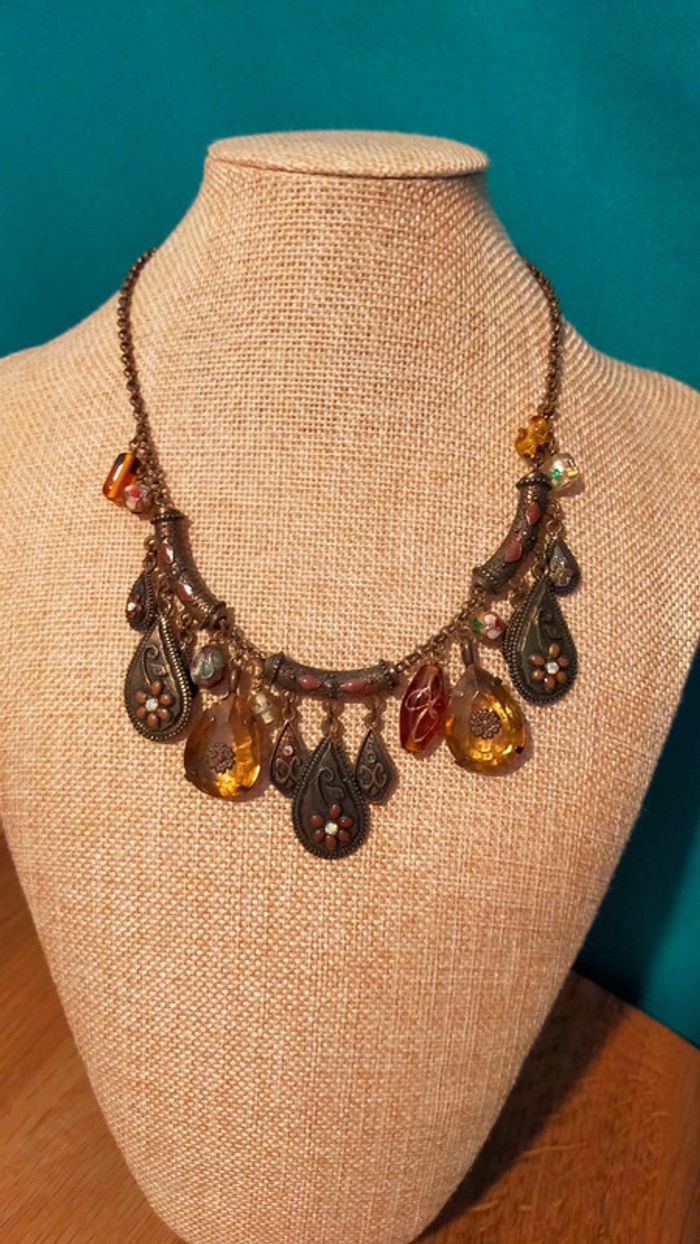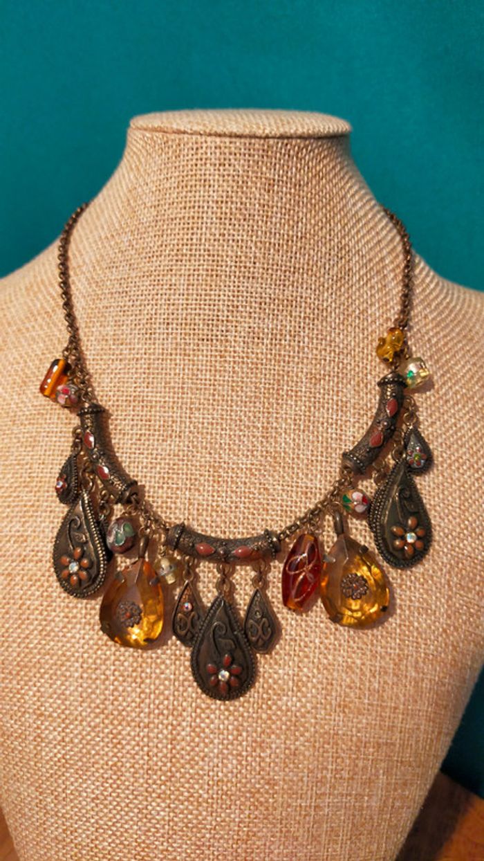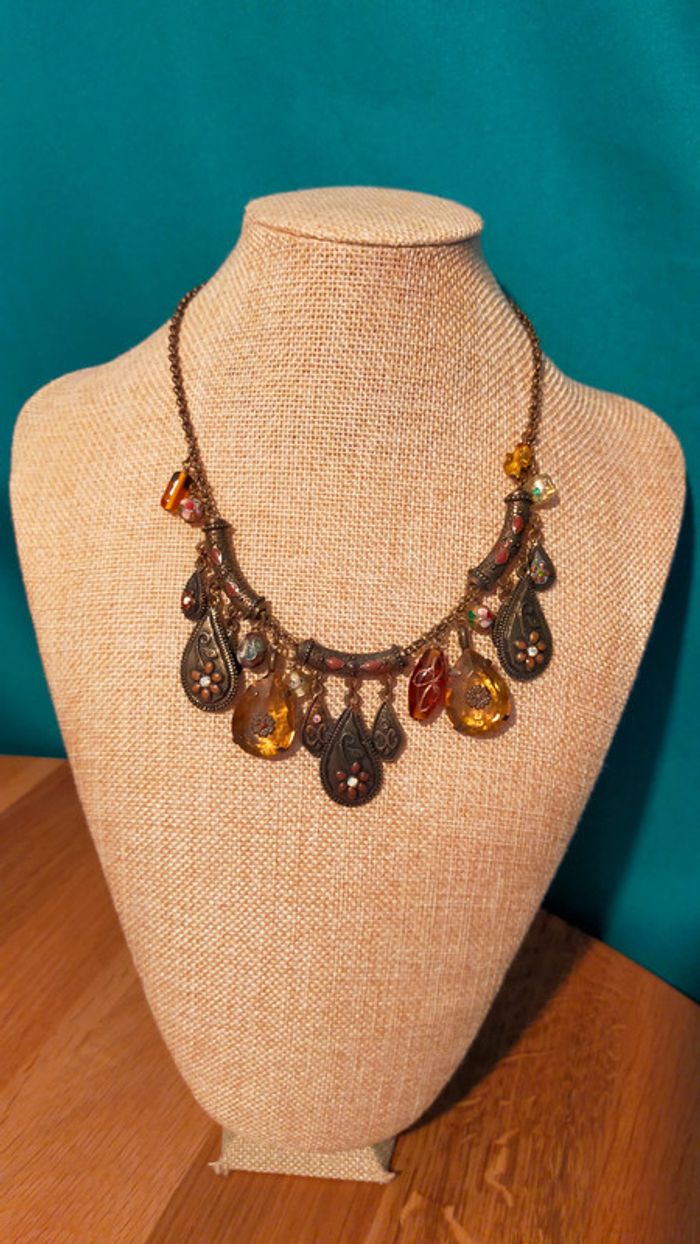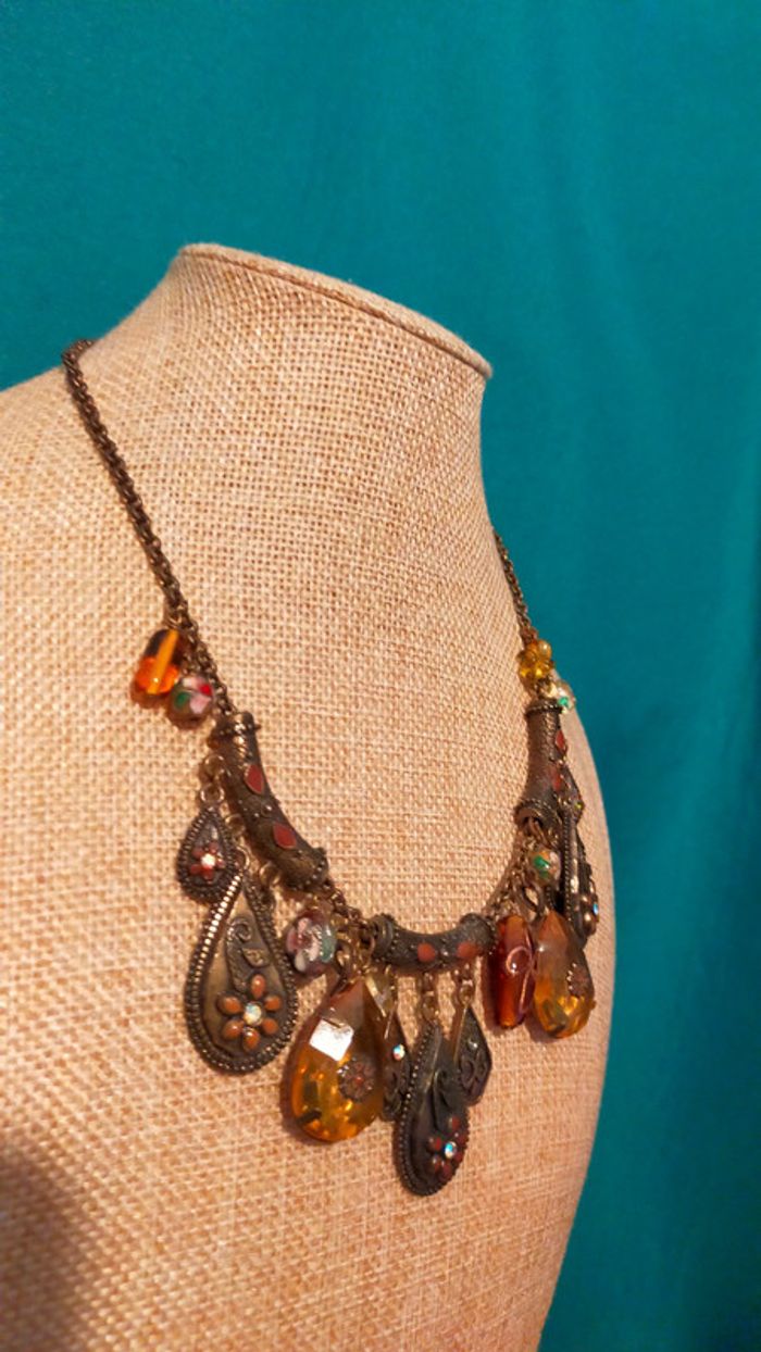 Magnifique collier ancien au style bohème chic, issu de la Collection Sable & Ébène. Il est composé de plusieurs pampilles en métal patiné façon bronze décorées d'émail coloré, associées à de grosses gouttes en verre facetté jaune ambré. Quelques perles émaillées multicolores viennent parfaire l’ensemble avec beaucoup de charme. 💎 Matières : Métal patiné (alliage) Émail Verre 📏 Dimensions : Longueur totale environ 44 cm (+ chaînette de réglage si présente) Pampilles principales : environ 3 à 4 cm ✨ État : Très bon état vintage 🎁 Collection Sable & Ébène : Chaque pièce est sélectionnée pour son cachet et son originalité. L5V #colliervintage #bijouancien #bijoubohème #stylebohème #bijouvintage #collierethnique #vintagestyle #accessoiresvintage #collectionSableEbene