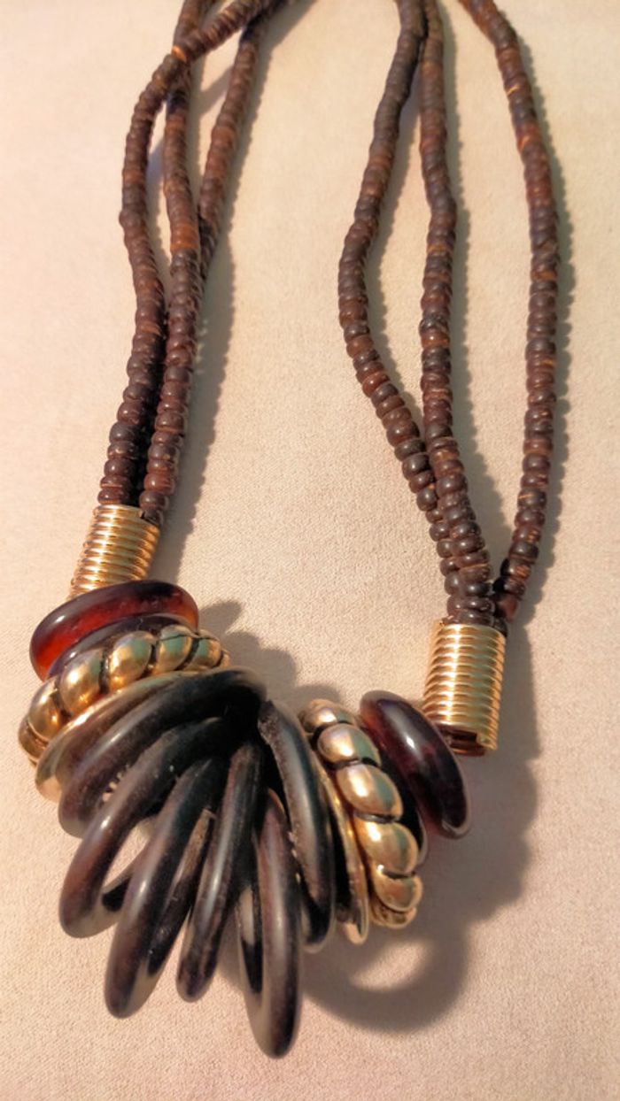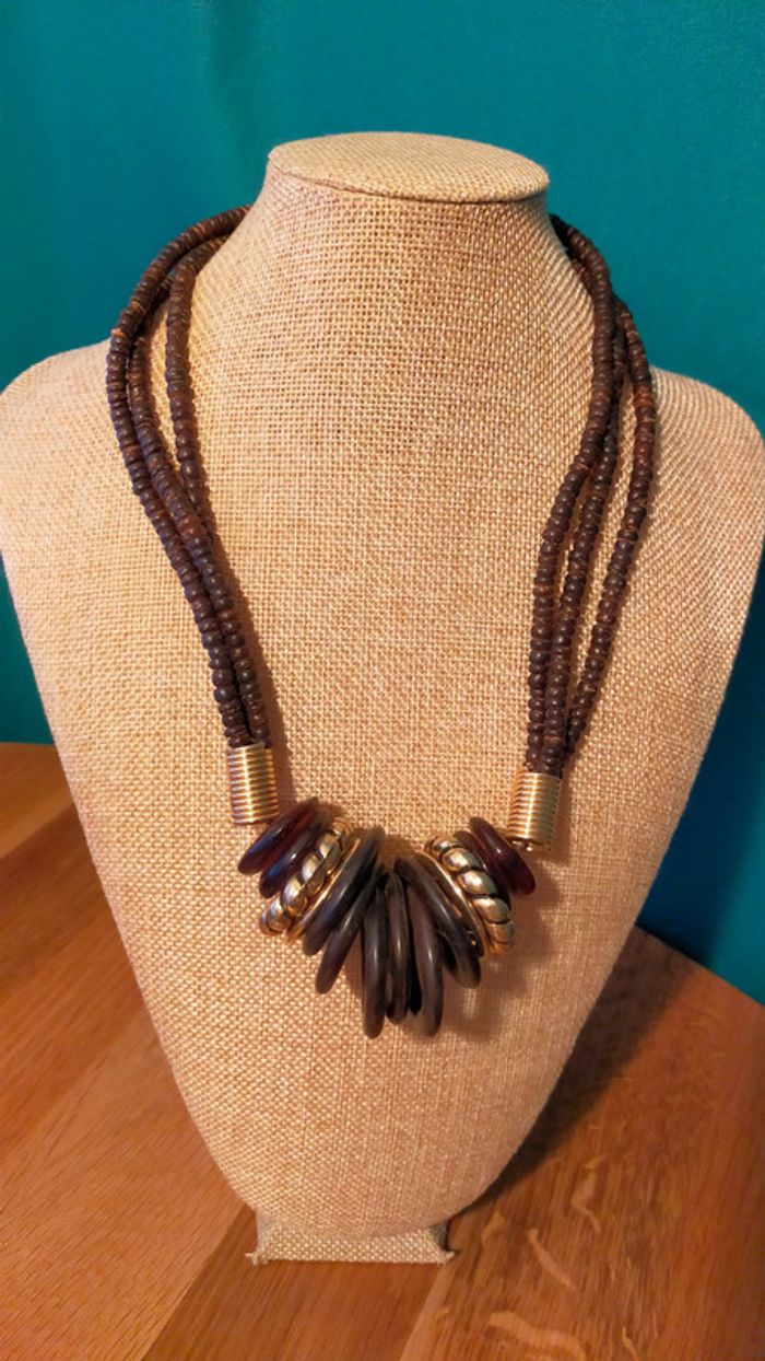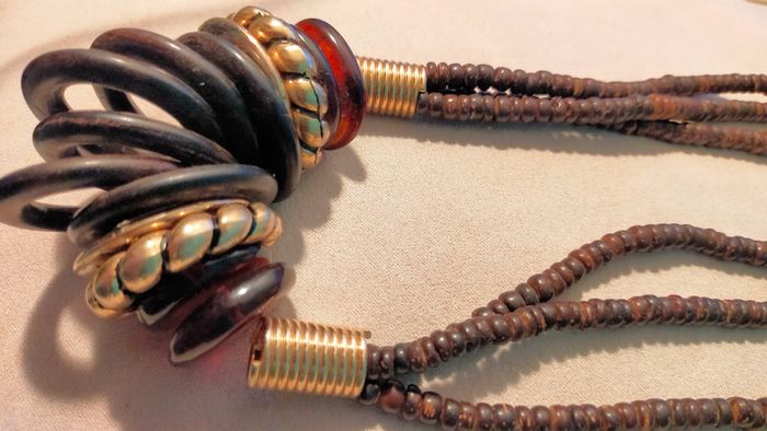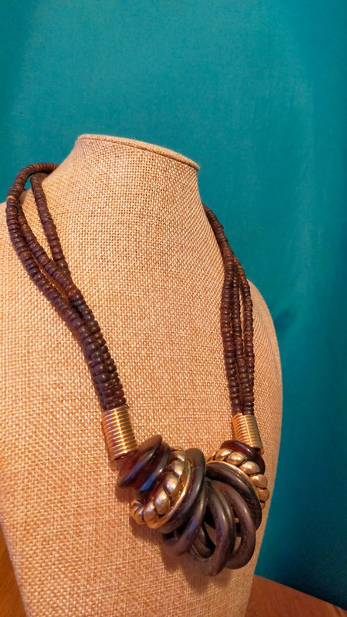 Pièce imposante et audacieuse, ce collier vintage ne passe pas inaperçu ! Trois rangs de perles sombres en bois ou graines naturelles se rejoignent pour soutenir un somptueux jeu d'anneaux contrastés : bois foncé, anneaux dorés torsadés, et perles ambrées translucides. Une belle harmonie de matières et de couleurs, idéale pour une allure affirmée aux inspirations ethniques et vintage. 🔸 Matières : bois sombre, métal doré (probablement fantaisie), résine ou plastique imitation ambre 🔸 Fermoir : mousqueton doré vintage 🔸 État : bon état vintage (quelques traces d’usage sur le métal, visibles en gros plan) 🔸 Longueur : mi-long (collier ras de cou large ou court sautoir selon la morphologie) L2V #colliervintage #bois #doré #ethniquechic #terresdailleurs #bijouoriginal #modeethnique #vintageaddict #collierbois #faitmainstyle #vintagestyle #accessoirechic