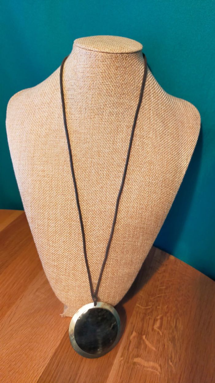 Sublime collier ras-de-cou ou sautoir finement exotique, orné d’un large médaillon en nacre naturelle aux reflets changeants, monté sur un cordon noir. 💫 Pièce originale, parfaite pour une touche bohème ou ethnique chic. 📍 Détails : • Pendentif : nacre naturelle double face, aux jolis reflets verts et beiges • Diamètre pendentif : environ 6 cm • Longueur totale cordon : environ 80 cm (non réglable) • Fermeture : nœud coulissant possible / à nouer selon votre style • Matières : nacre, cordon textile (similicuir noir ou coton ciré) • État : très bon état • Collection : Terres d’Ailleurs 💡 Convient à toutes les tenues pour un look nature ou bord de mer. 🎁 Possibilité d’envoi en lot ou d’ajouter un petit cadeau surprise en cas de plusieurs achats ! L2R #collier #nacre #pendentifnacre #bijouxfantaisie #boheme #ethnique #naturel #collectionterresdailleurs #faitmainstyle #bijouartisanal #coquillage #bijouxoriginaux #collierlong