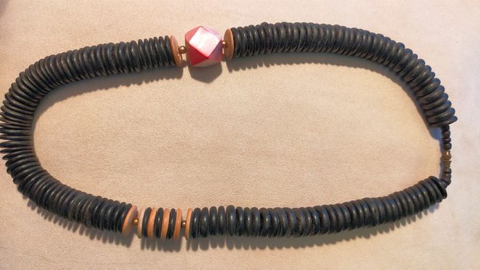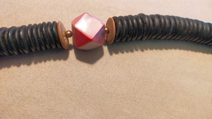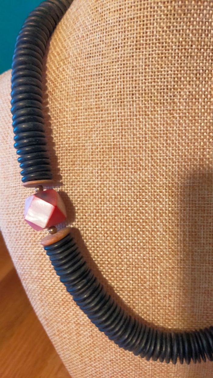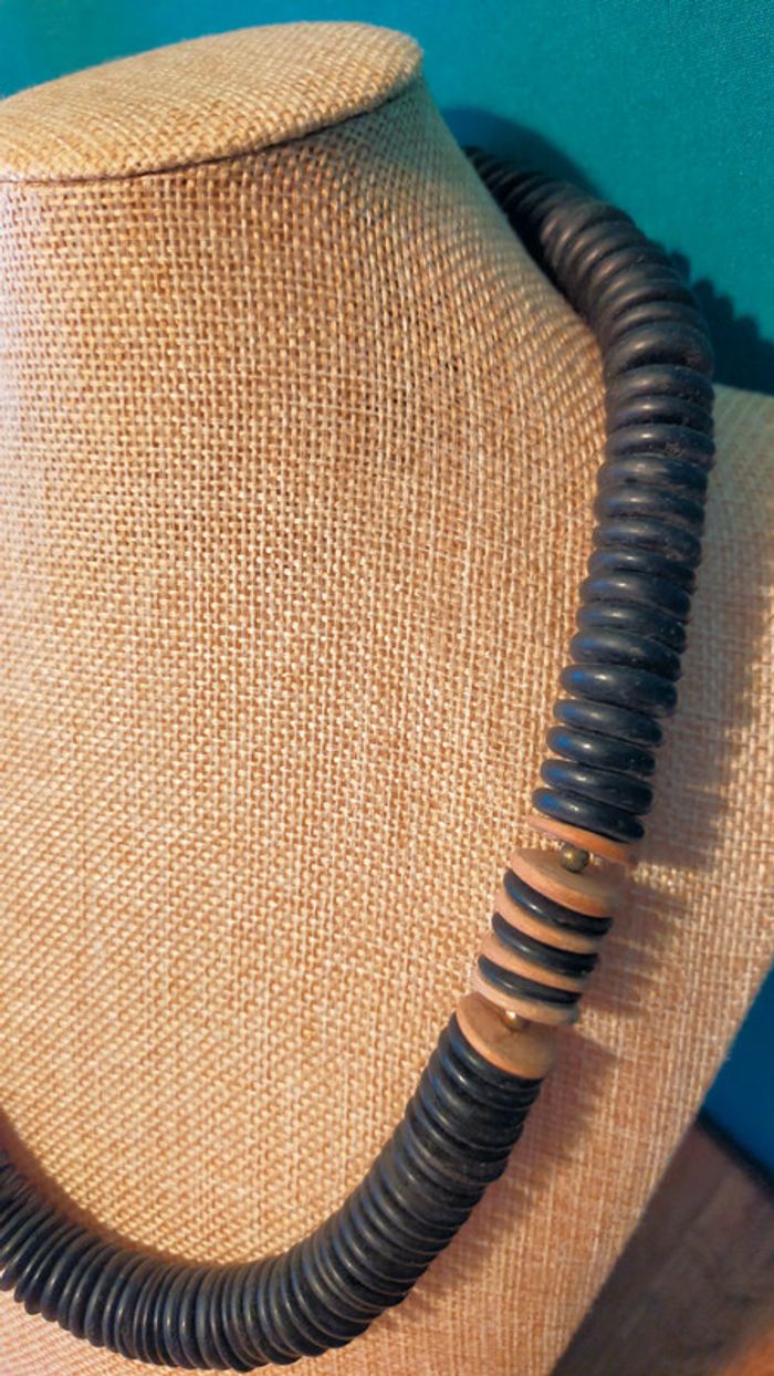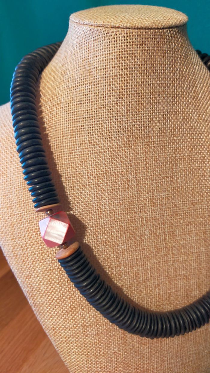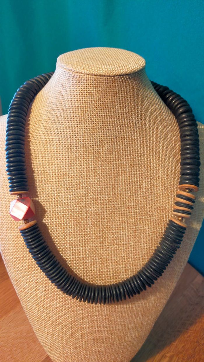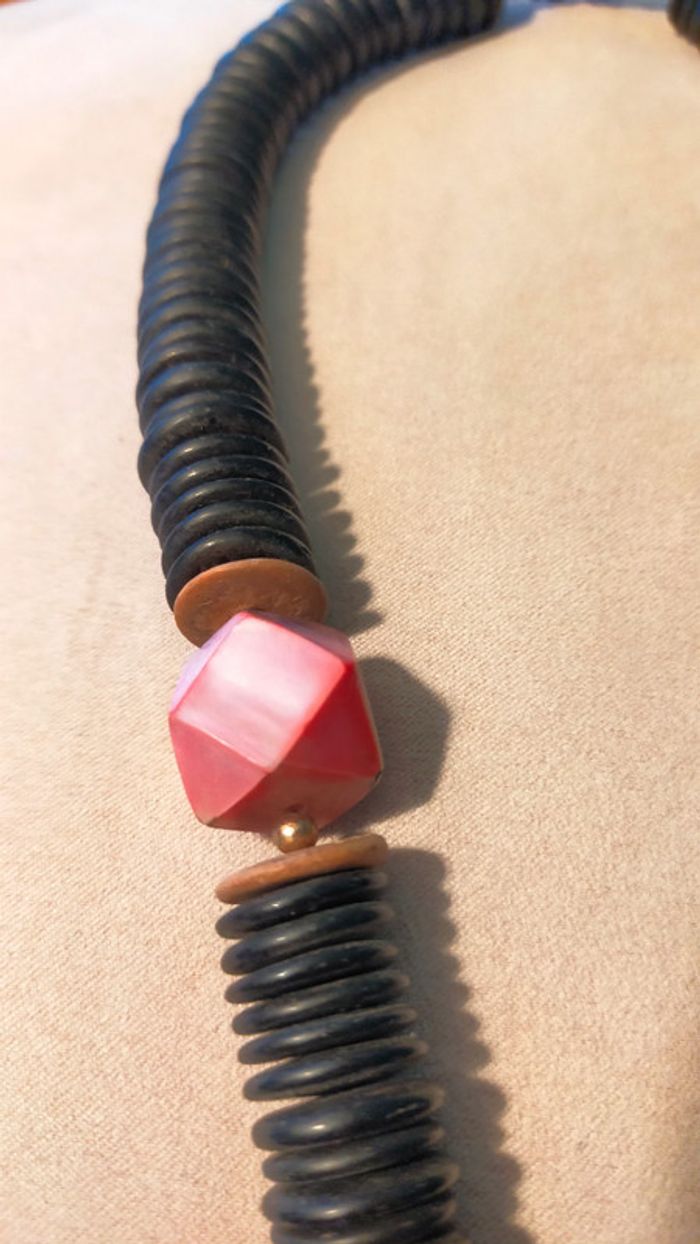 Collier composé d’un assemblage de grandes perles noires plates, rehaussées de rondelles bois et d’une perle centrale facettée rose irisée. Un bijou imposant, original et plein de caractère, parfait pour accessoiriser une tenue bohème, estivale ou un look minimaliste avec une touche forte. 📏 Longueur : environ 55 cm 📦 Fermoir discret à vis 📎 Matières : bois noirci, bois clair, perle centrale probablement en résine effet nacré 📆 État : bon état vintage, quelques marques discrètes d’usage 💬 Collection exclusive « Terres d’Ailleurs » – inspirations ethniques et naturelles 💡 Idée style : à porter seul comme pièce forte ou en superposition avec d’autres colliers bois ou métal pour un style nomade-chic. L2V #colliervintage #bijouxboheme #collierethnique #boisnaturel #terresdailleurs #bijouxfantaisie #styleboho #vintedfr #collieroriginal #bijouxvintage