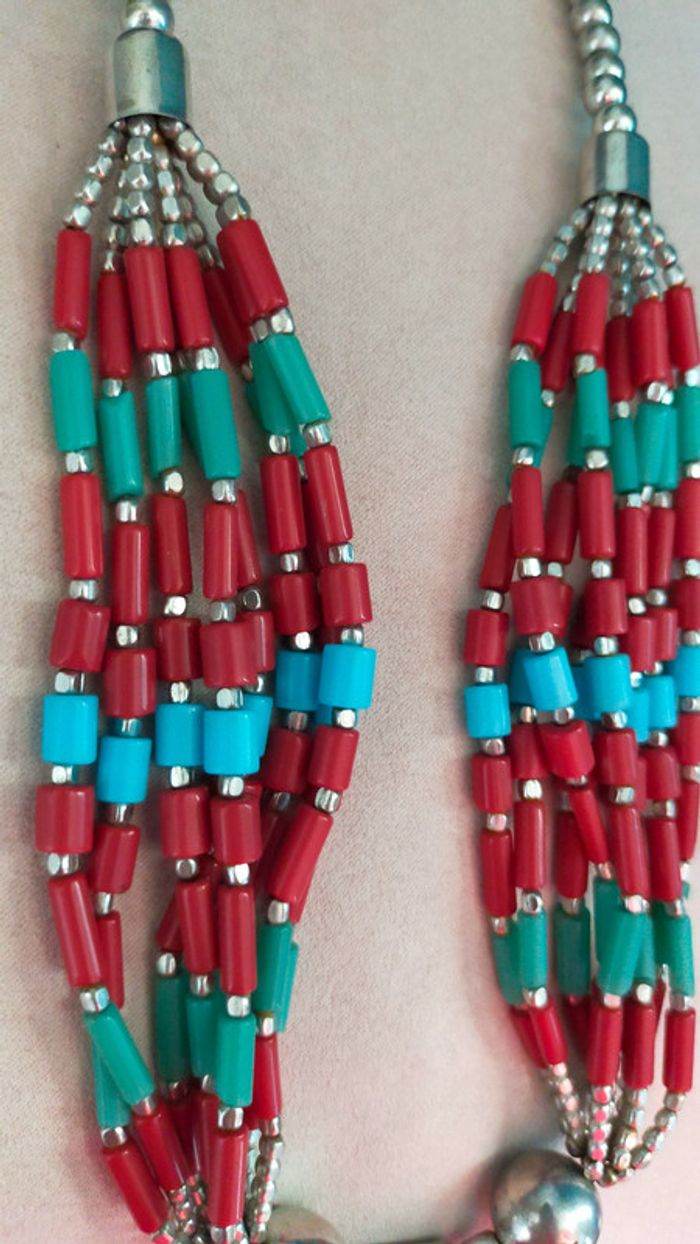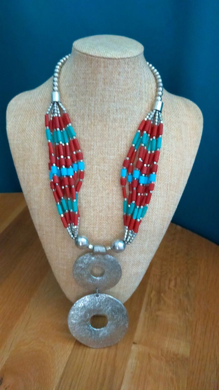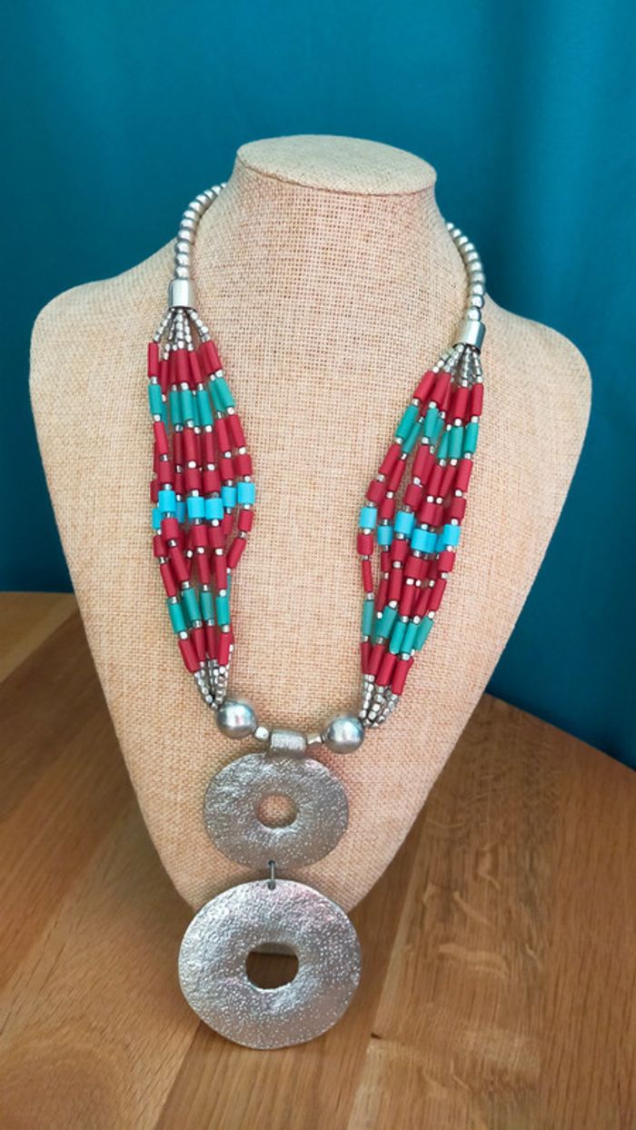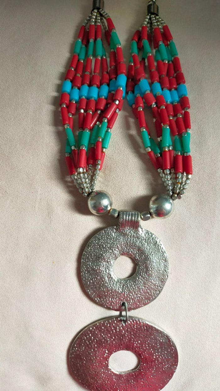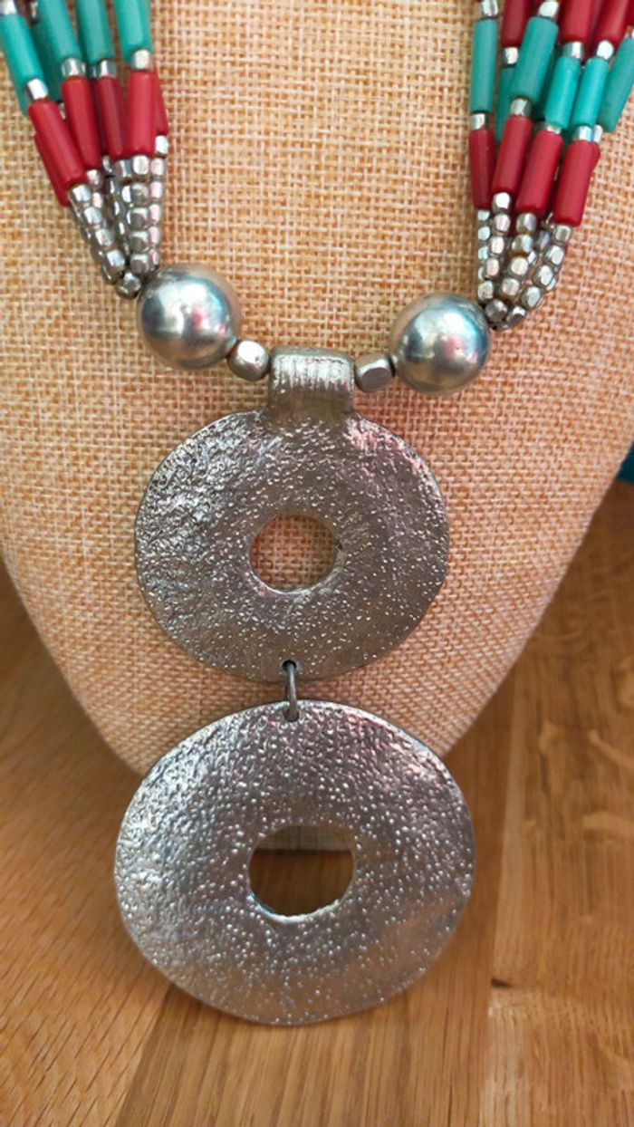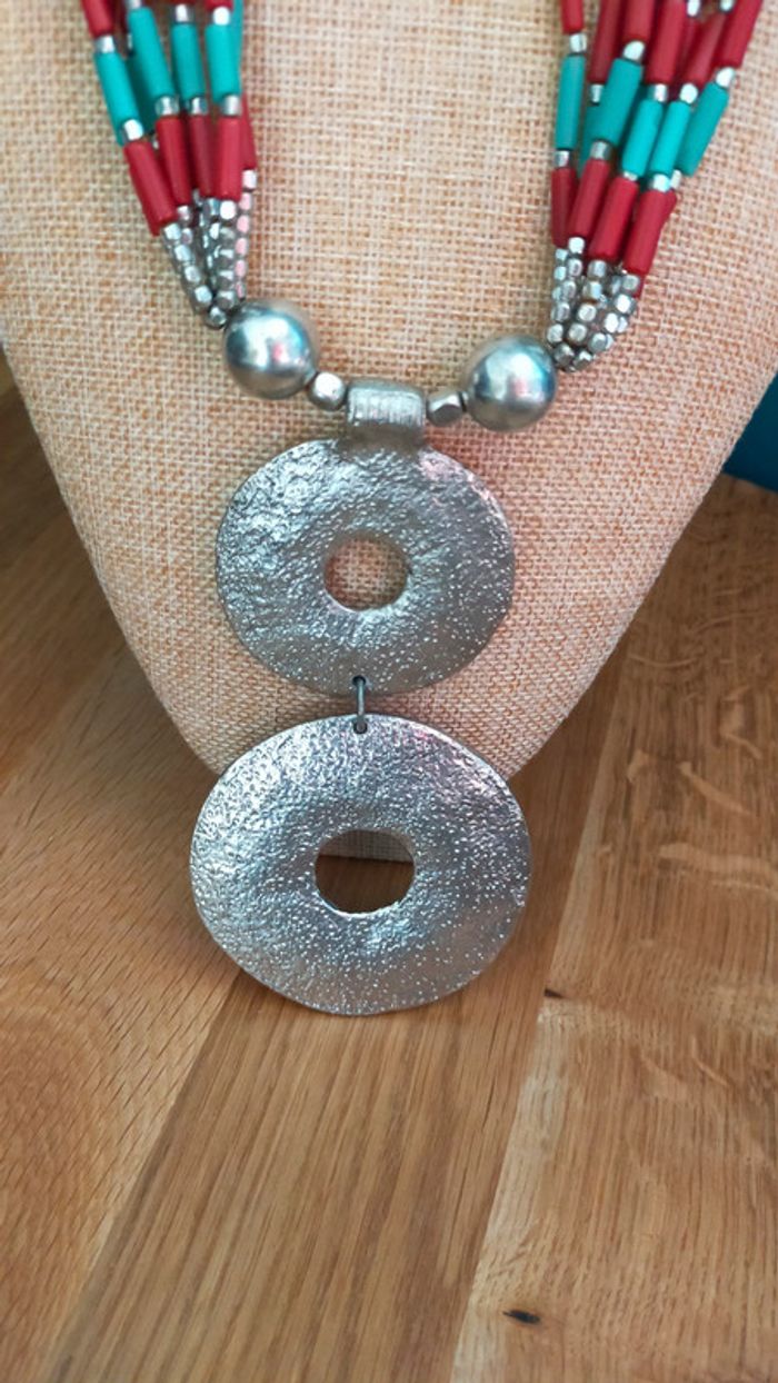 Collier vintage unique au style bohème-ethnique. Composé de multiples rangs de perles rouges, turquoises et vertes montées sur fil, il se termine par deux larges pendentifs ronds argentés martelés, apportant une touche artisanale très chic. Les perles en métal argenté ajoutent de la structure et de l’éclat. Fermoir crochet rétro. Pièce forte idéale pour sublimer une tenue sobre ou colorée. 🔹 Très bon état général. 🔹 Longueur approximative : 55 cm + pendentif 🔹 Bijou ancien, non signé, rare. 💡 Pièce originale qui rappelle les bijoux amérindiens ou mexicains revisités façon années 80. 📸 Photos contractuelles – vendu tel que présenté. 📦 Envoi rapide & soigné. 🎁 Possibilité d’envoi en lot ou petit bijou surprise pour les commandes multiples ! LBVIN2 #collier #colliervintage #bijouvintage #collierethnique #collierboheme #bijouoriginal #vintagestyle #statementnecklace #colliercoloré #perlesvintage #bijouretro #collierpendant #upcycledjewelry #modevintage #bijouancien