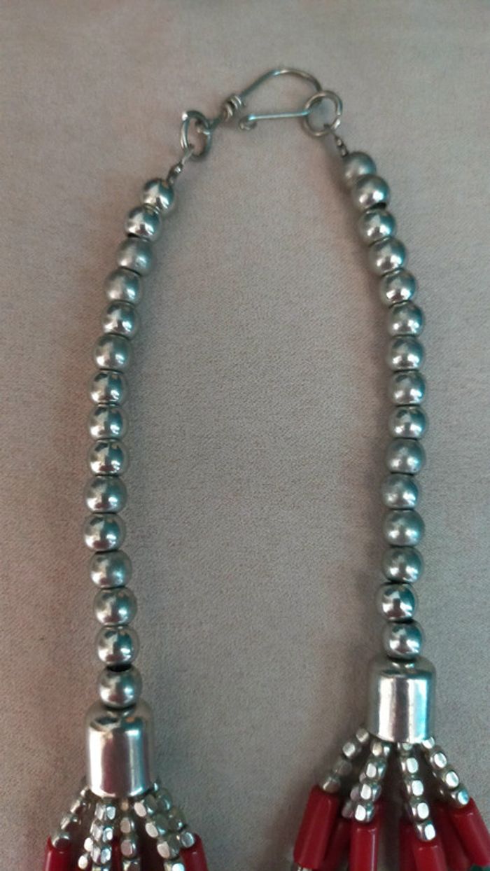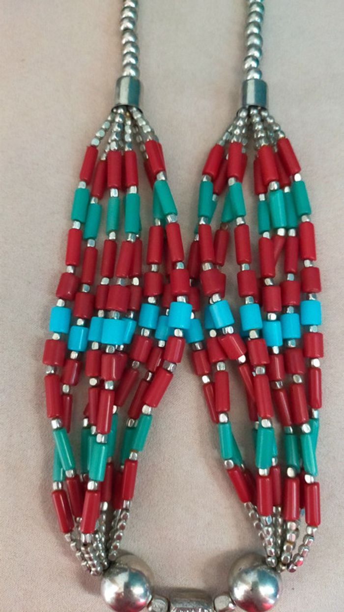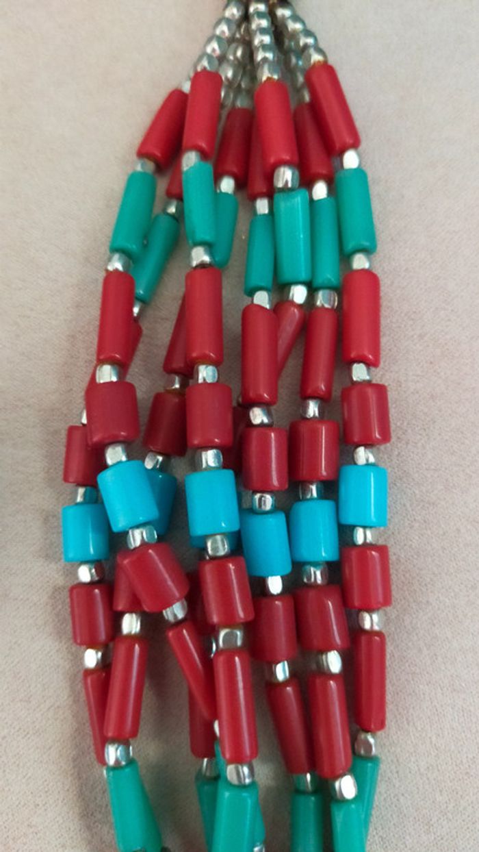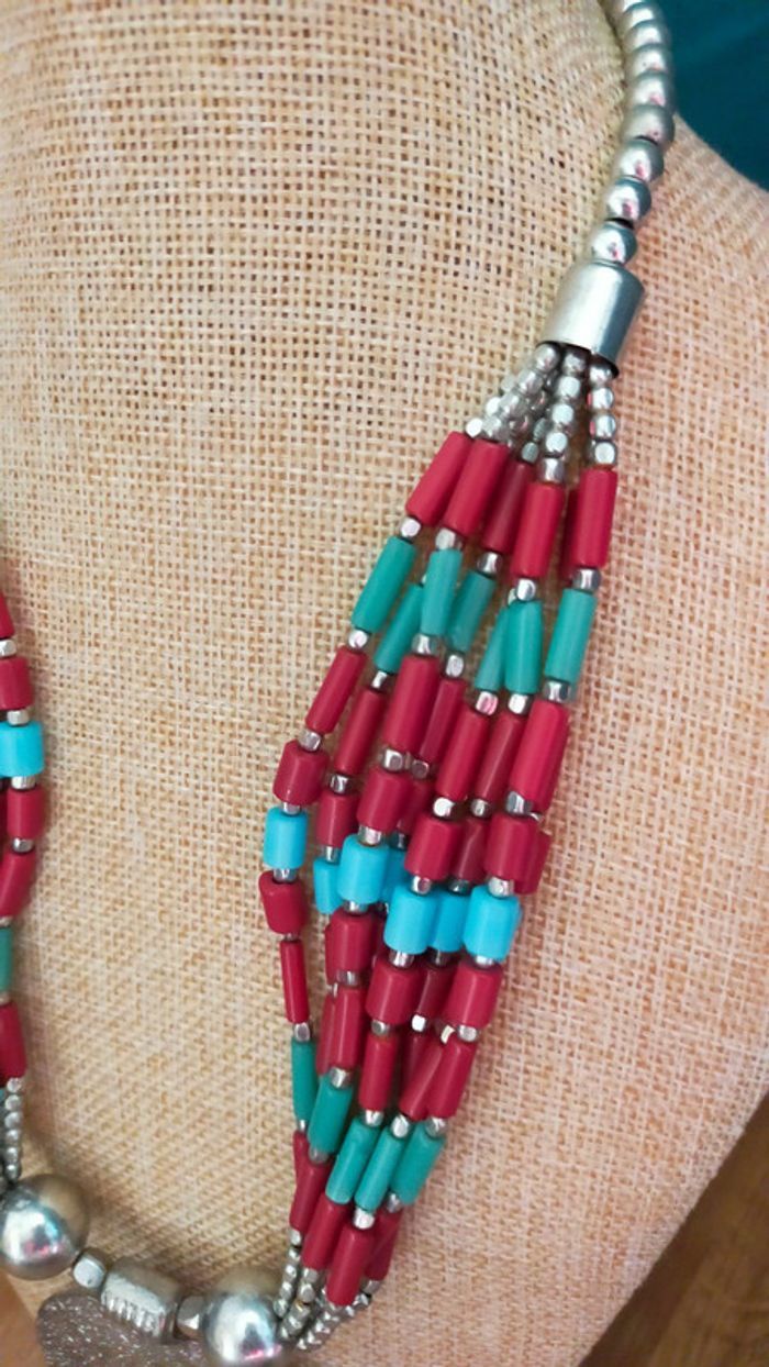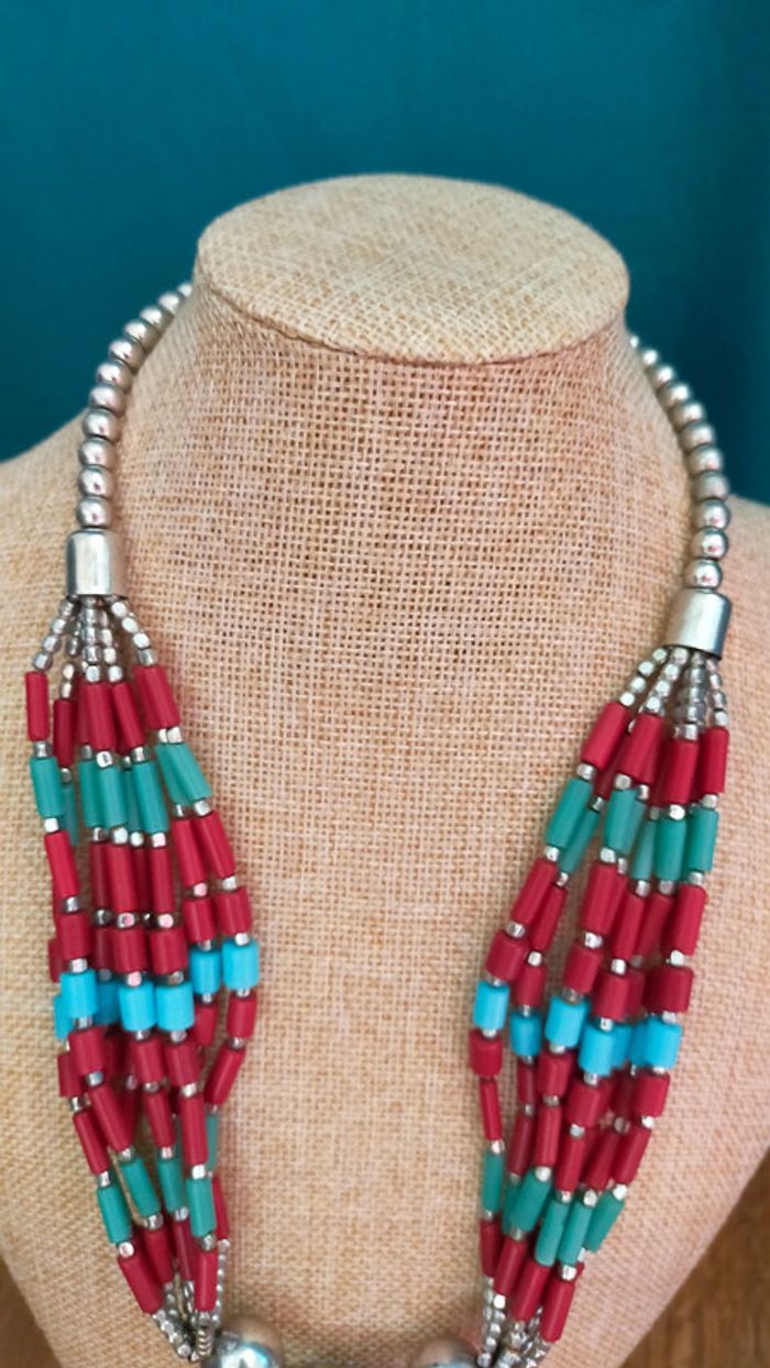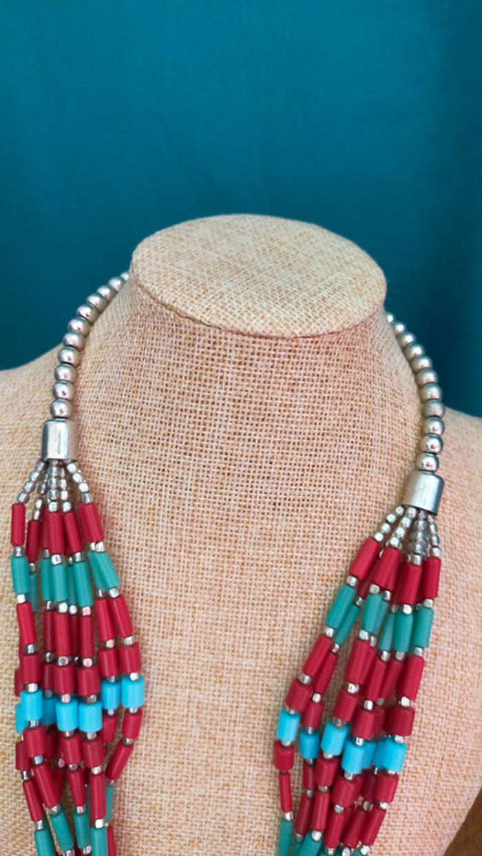 Collier vintage unique au style bohème-ethnique. Composé de multiples rangs de perles rouges, turquoises et vertes montées sur fil, il se termine par deux larges pendentifs ronds argentés martelés, apportant une touche artisanale très chic. Les perles en métal argenté ajoutent de la structure et de l’éclat. Fermoir crochet rétro. Pièce forte idéale pour sublimer une tenue sobre ou colorée. 🔹 Très bon état général. 🔹 Longueur approximative : 55 cm + pendentif 🔹 Bijou ancien, non signé, rare. 💡 Pièce originale qui rappelle les bijoux amérindiens ou mexicains revisités façon années 80. 📸 Photos contractuelles – vendu tel que présenté. 📦 Envoi rapide & soigné. 🎁 Possibilité d’envoi en lot ou petit bijou surprise pour les commandes multiples ! LBVIN2 #collier #colliervintage #bijouvintage #collierethnique #collierboheme #bijouoriginal #vintagestyle #statementnecklace #colliercoloré #perlesvintage #bijouretro #collierpendant #upcycledjewelry #modevintage #bijouancien