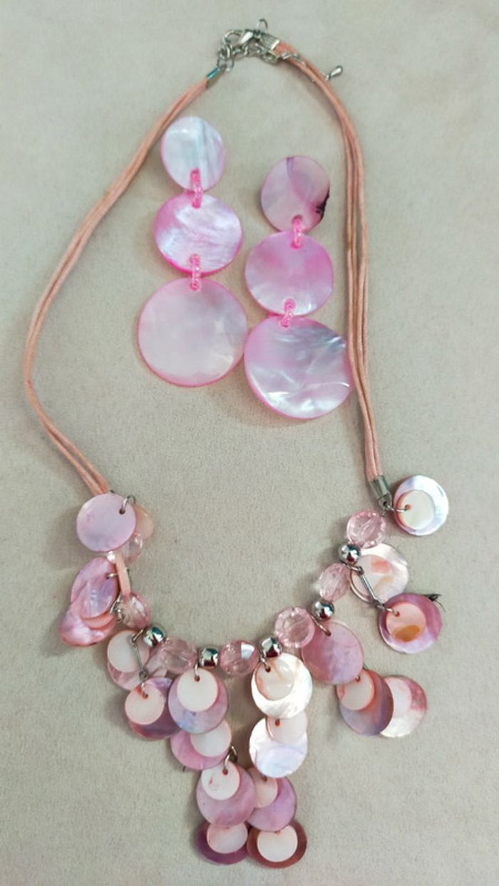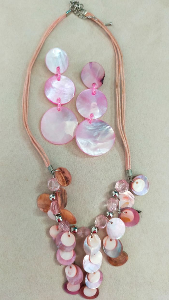 Parure élégante et délicatement féminine composée : D’un collier léger en fils roses et perles en nacre naturelle teintée rose clair, associées à des perles transparentes et argentées. D’une paire de boucles d’oreilles pendantes coordonnées, faites de disques de nacre rose irisé cousus façon guirlande. 🔹 Fermoir mousqueton classique + chaîne d’extension 🔹 Longueur du collier : ajustable 🔹 Boucles d’oreilles : légères et mobiles 🔹 Parure probablement faite main 💡 Idéale pour l’été, cette parure rétro peut se porter pour une tenue de tous les jours ou pour accessoiriser un look plus bohème ou romantique. 📦 État : Très bon état vintage 📍 Pièce vintage soigneusement sélectionnée L10V #parure #colliervintage #bouclesdoreilles #bijouxvintage #nacre #colliernacre #bijourose #bijouété #stylebohème #vintageaddict #nacreteintée #collectionrose #nuancesderose