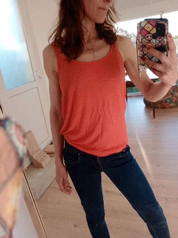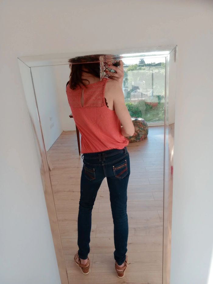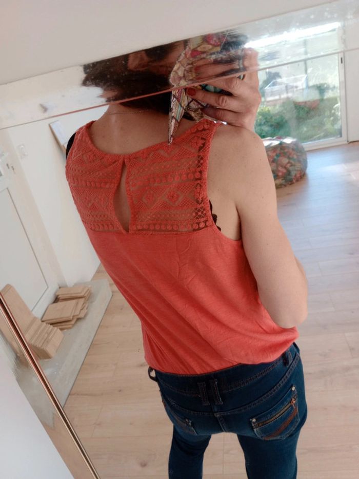 Joli débardeur😻 avec empiècement tulle et crocheté à l'arrière au niveau de la nuque ( que l'on retrouve également au niveau des bretelles) avec un espace qui laisse entrevoir le dos Un trou à l avant et 2 a l'arrière dans le bas : voir les six dernières photos , 2 photos pris de loin et plus proche pour les trois petits trous reste superbe 🥰 Bretelle à bretelles 32 cm aisselle 50 cm longueur 68 cm Plus d'étiquette matière ni taille #carineleray_femme_40