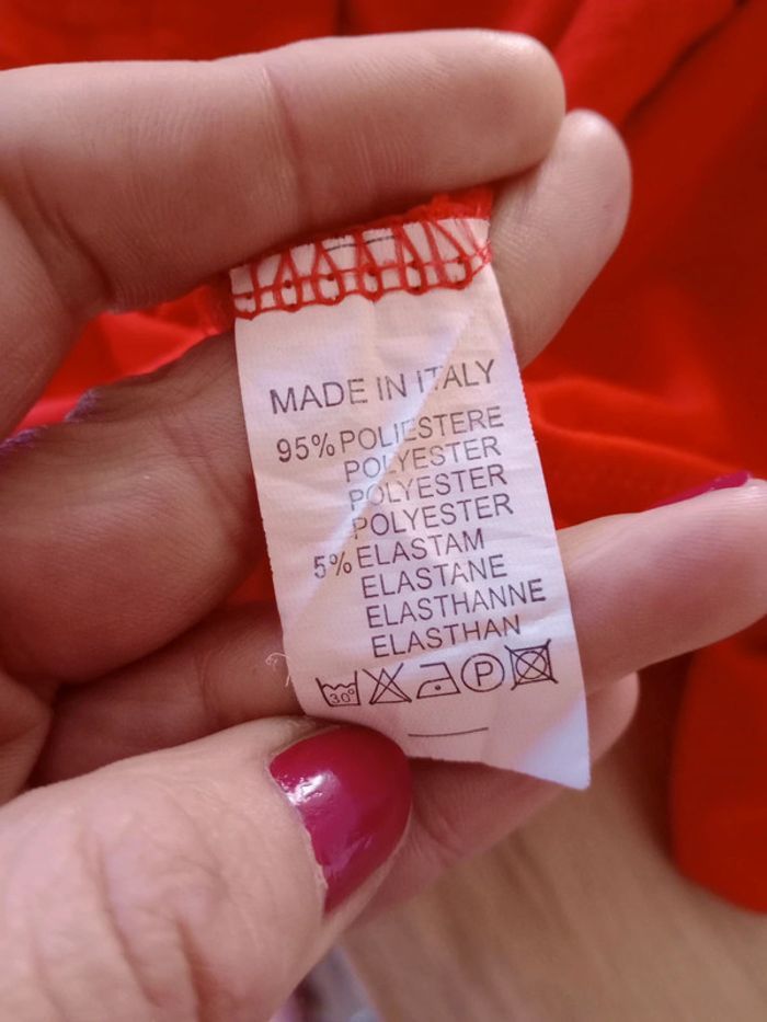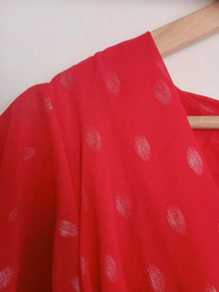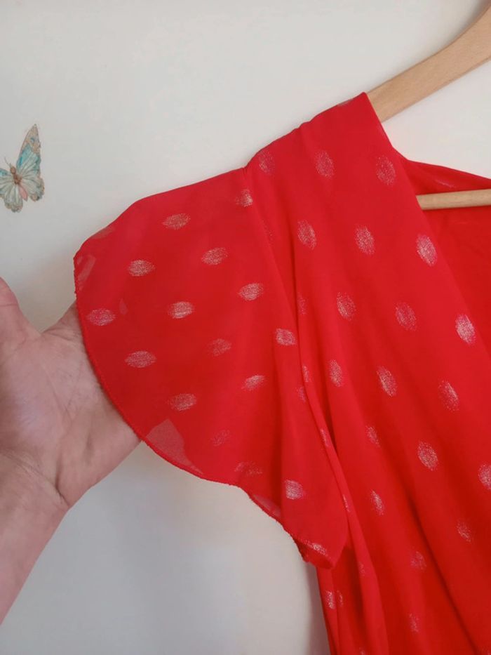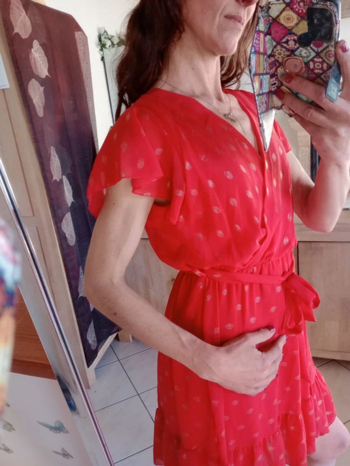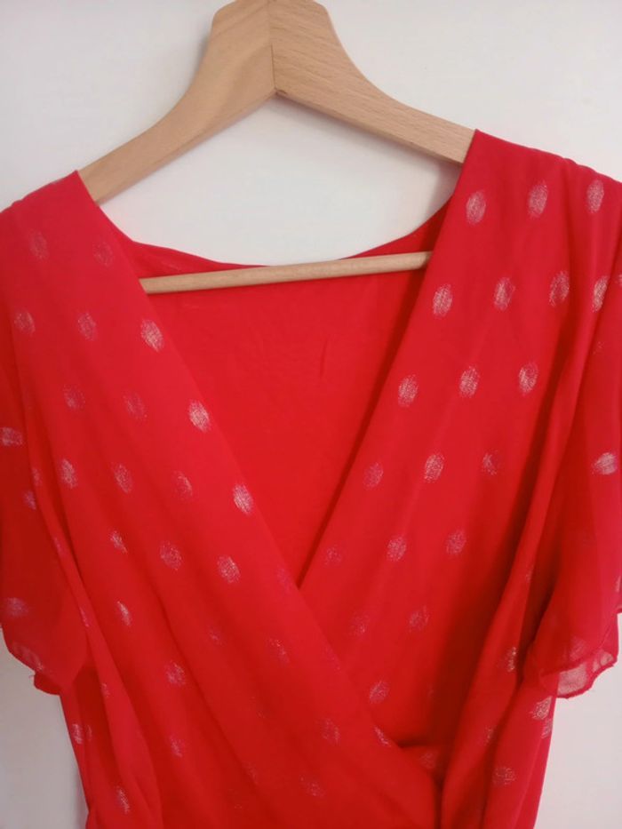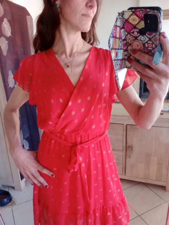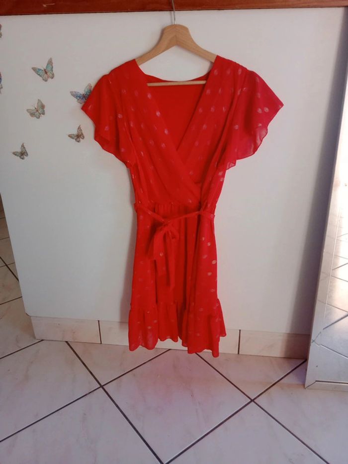 Robe courte rouge à pois dorés - Fabrication Italienne ​Très jolie robe légère et féminine, idéale pour une cérémonie, une soirée ou une sortie estivale. Elle est fluide et agréable à porter. ​Détails de l'article : ​Couleur : Rouge vif avec motifs pois dorés brillants. ​Coupe : Cache-cœur (décolleté en V croisé) avec une taille élastiquée pour marquer la silhouette. ​Manches : Manches courtes fluides style "papillon". ​Finition : Ceinture fine assortie à nouer à la taille. ​Doublure : La robe est doublée pour éviter la transparence. ​Composition : 95% Polyester, 5% Élasthanne. ​Origine : Made in Italy. Aspect neuve😍🥰 Plus d'étiquette marque ni taille Épaule 38 cm longueur 89 cm #calomomi_femme38 ​#roberouge #robeete #robeceremonie #robocachecoeur #madeinitaly #modefemme #robelégère #poisdorés #lookfeminin