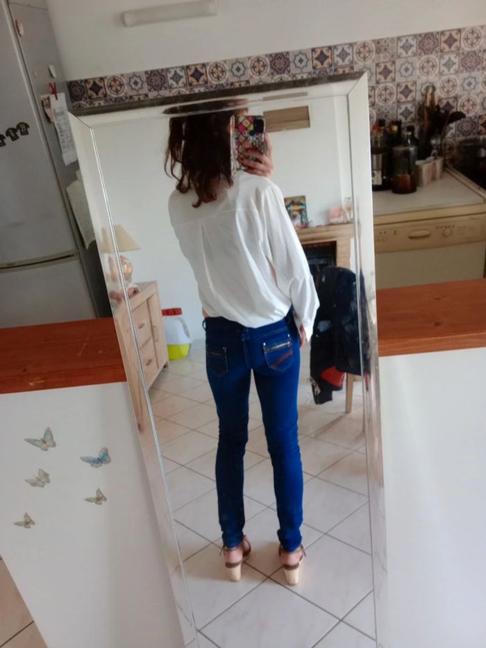 Superbe pièce❤️❤️❤️, impeccablement entretenue 🥰intemporelle et indémodable Un cache boutonnière Un lien et un bouton au niveau des manches ce qui permet de remonter la Manche En forme de u , longueur la plus grande 70 cm et la plus petite 52 cm La matière est très agréable et légère Plus d'étiquette marque Deux petits points grosses comme une tête d'épingle voir les deux dernières photos... Faut vraiment le voir 🤣 #carineleray_femme_42