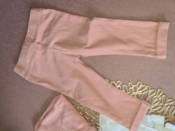 Comme neuf porté 1 seul fois .ensemble 12 mois 3 pièces kiabi . Acheter en avril 2025 collection actuelle. Comprenant un legging rose avec gilet assorti et blouse fine blanche à bretelles. Articles non négociable