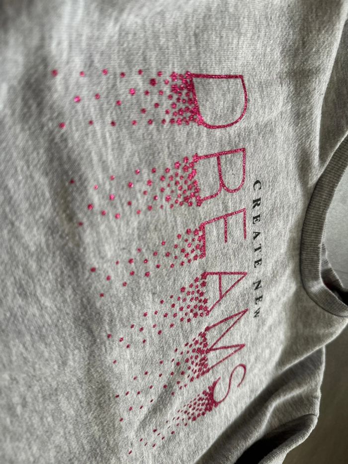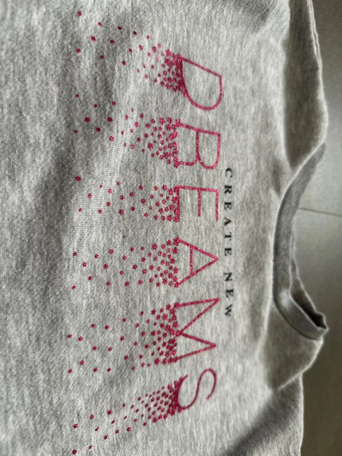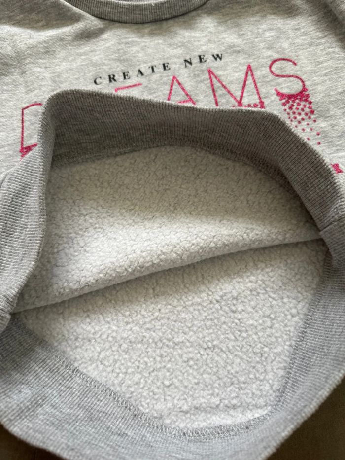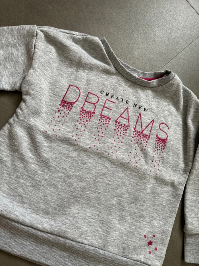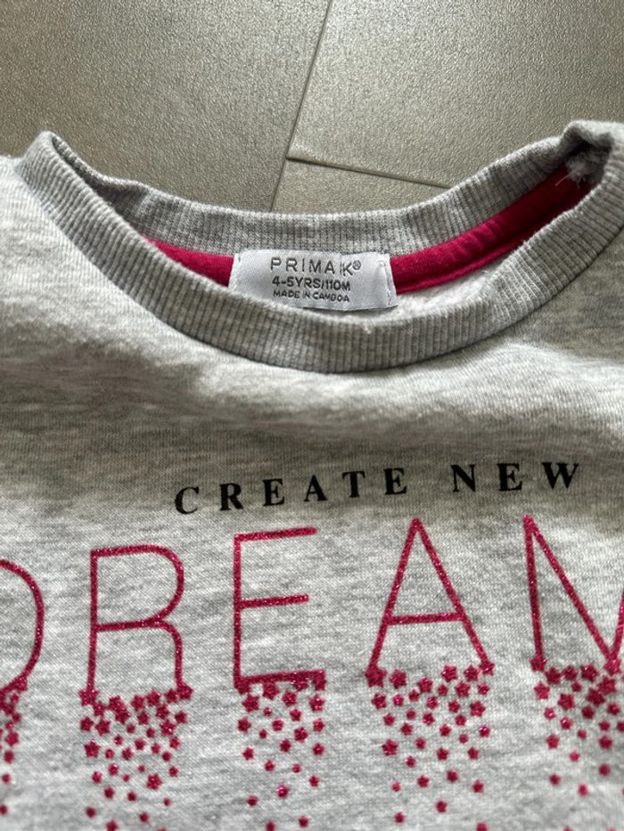 Pull sweat gris impression pailletée, taille 4 ans de la marque Primark. Très bon état, pas de tache ni trou constaté. #emireims4ans