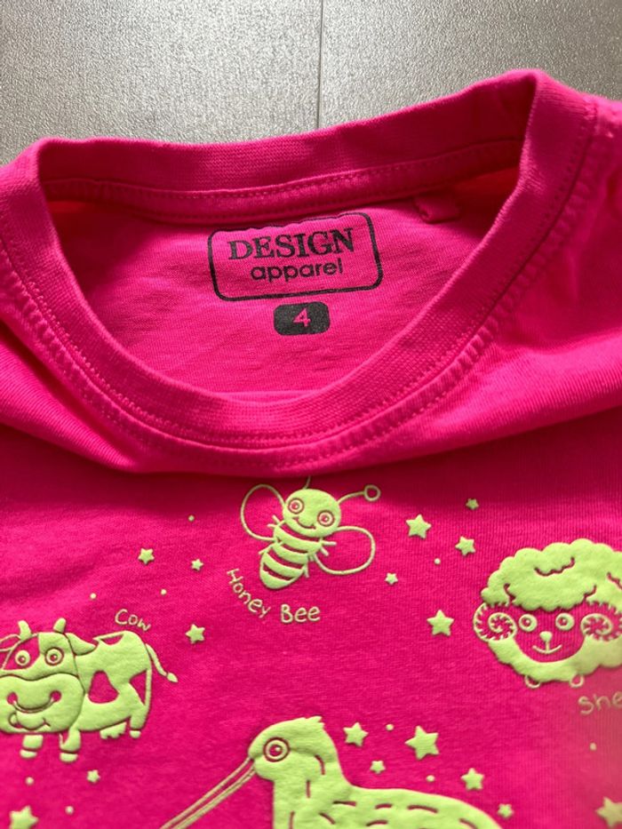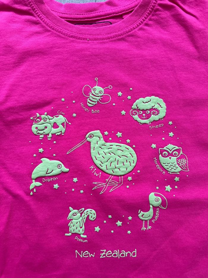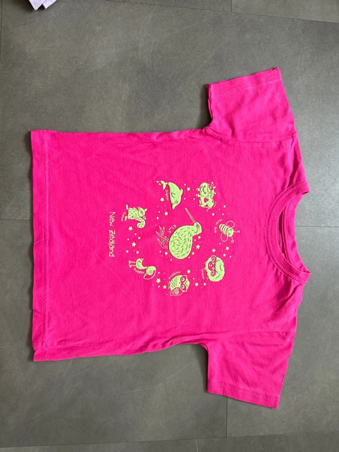 Teeshirt rose de nouvelle Zélande, taille 4 ans. Les impressions brillent dans le noir. Très bon état, pas de tache ni trou constaté. #emireims4ans