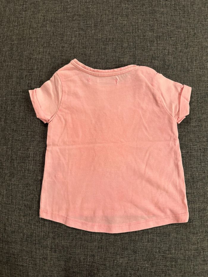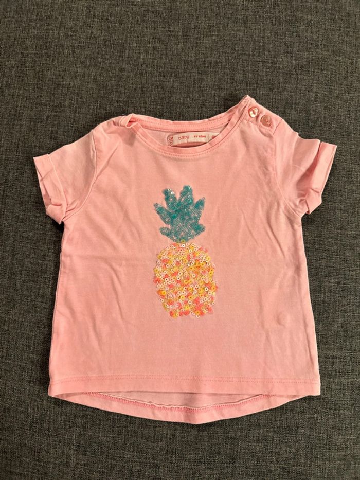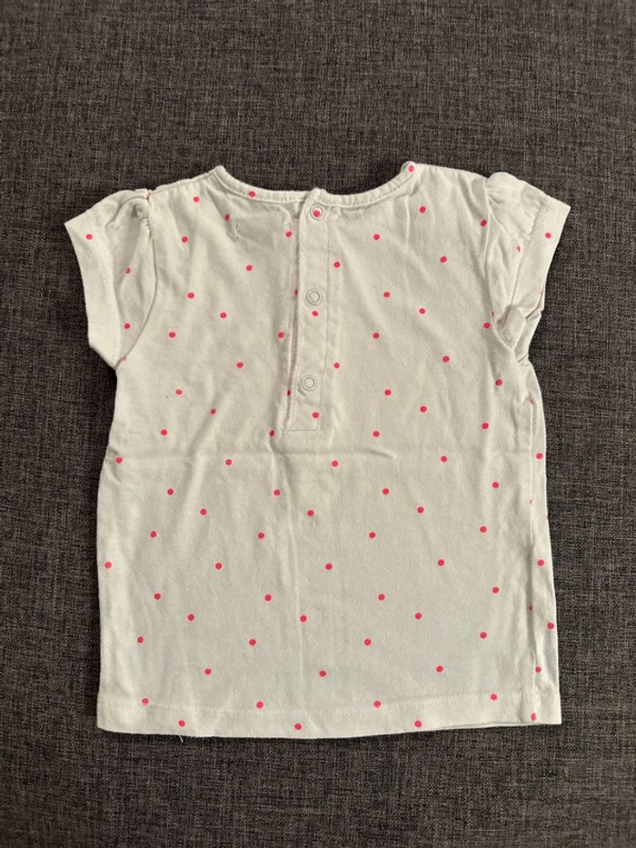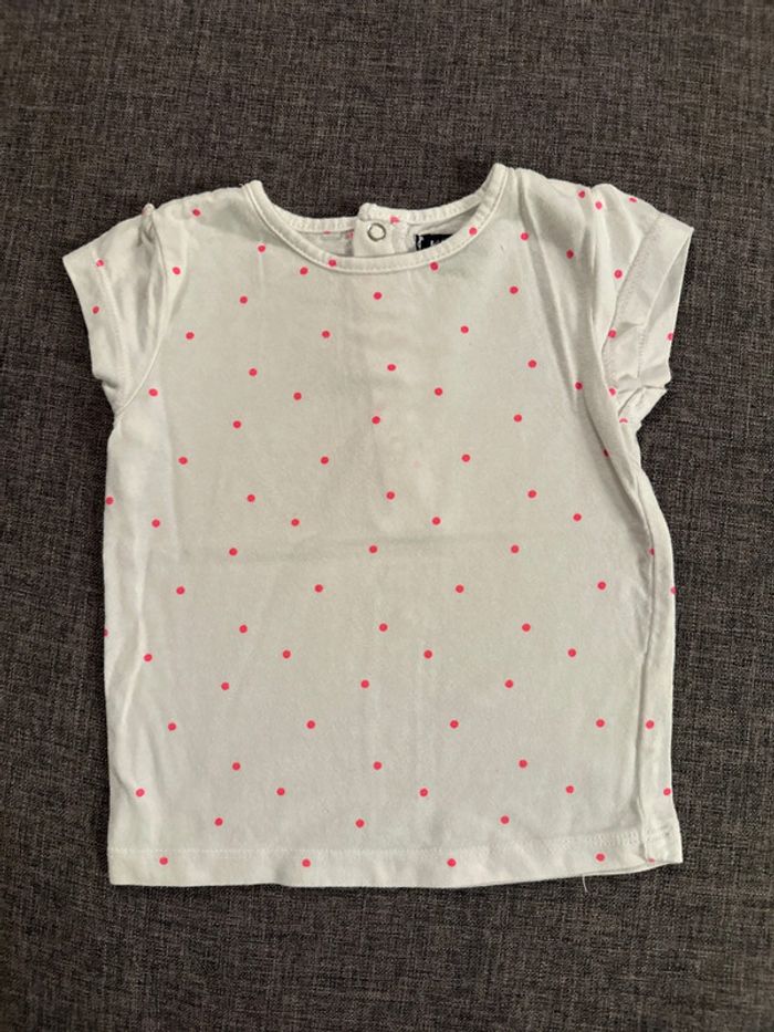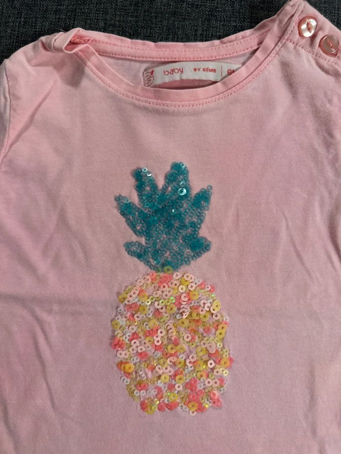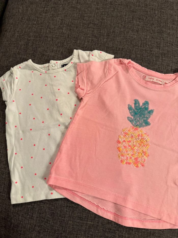 Lot de 2 tee-shirts en 6 mois, blanc à pois rose Kiabi et rose ananas sequins Gémo. Très bon état, pas de tache ni trou constaté. #emireims6mois