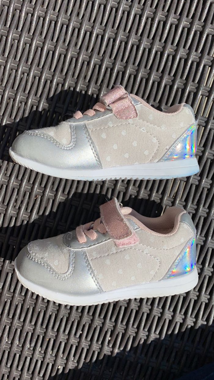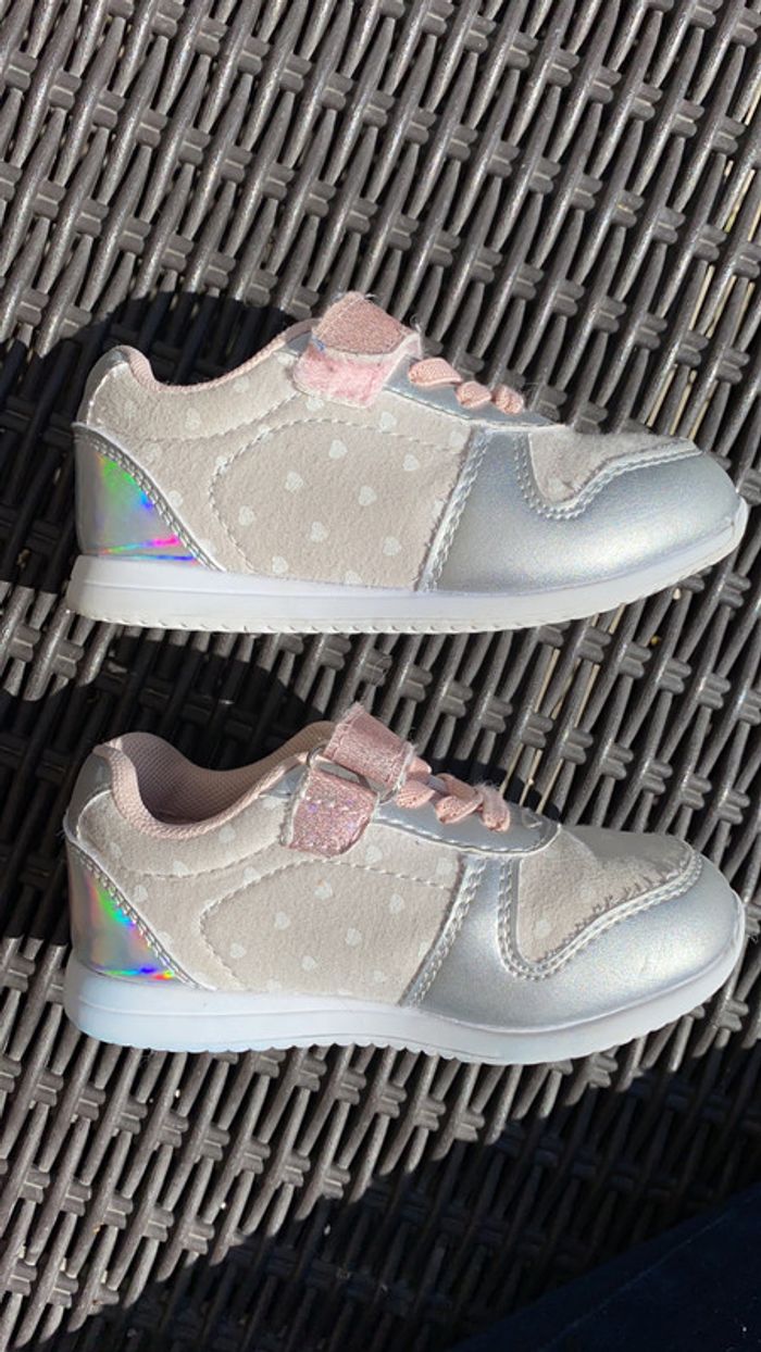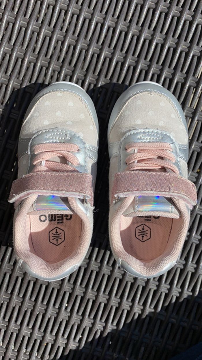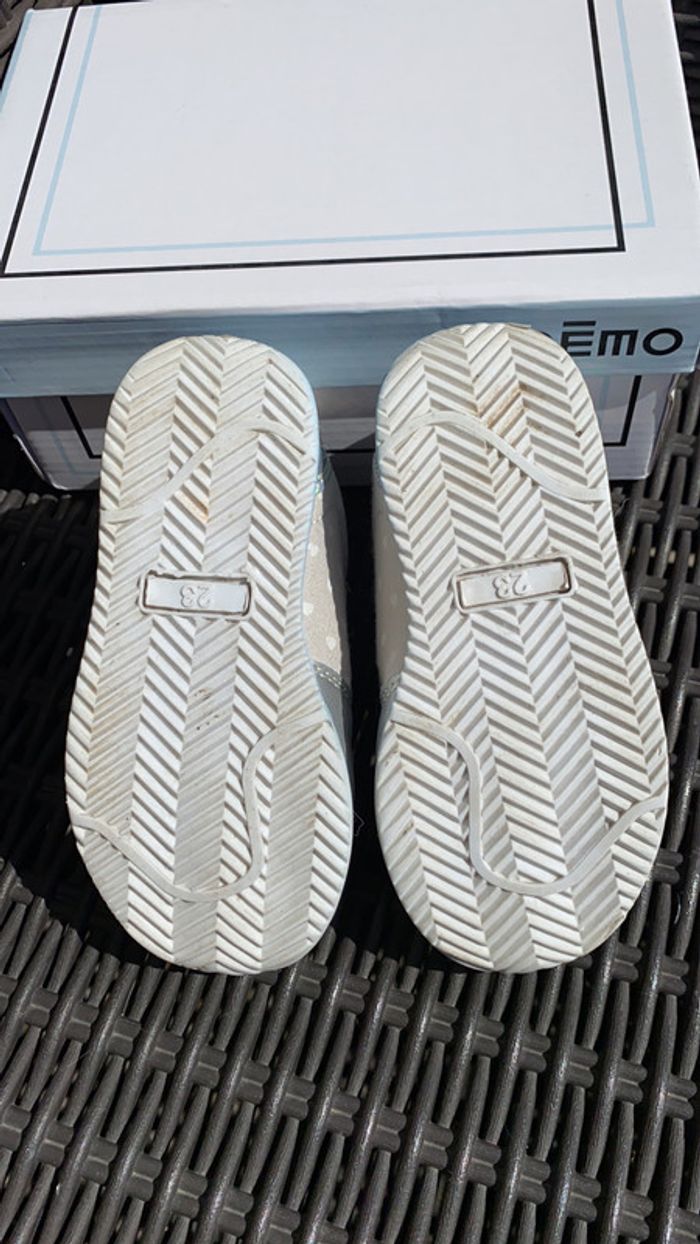 Baskets achetées chez Gemo. Pointure 23. Elles n’ont été utilisé qu’à l’école (en intérieur) 4 mois (de septembre à décembre). Lacets fixes élastiques et le scratch permettent à l’enfant de les mettre facilement. Très bon état (les 2 marques sur les semelles intérieures proviennent des étiquettes prénom que j’avais collé). Envoi dans leur boîte d’origine. #emireimschaussures