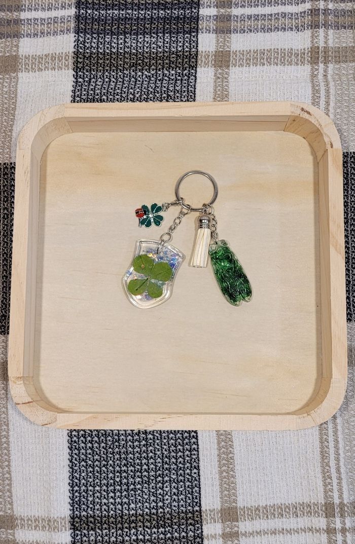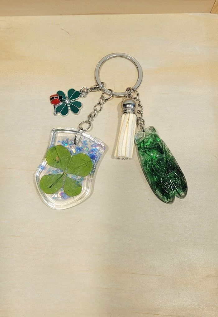 Porte-clés/Porte-bonheur artisanal Trèfle à 4 feuilles véritable et cigale Possibilité d'échanger un des pendants par une lettre faite sur demande. Livré dans un étui en organza Emballage cadeau sur demande