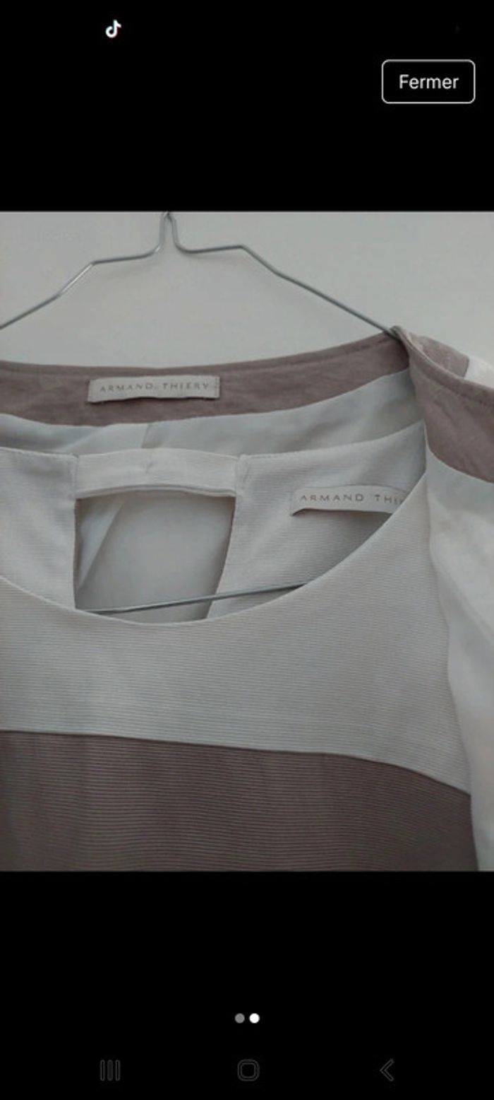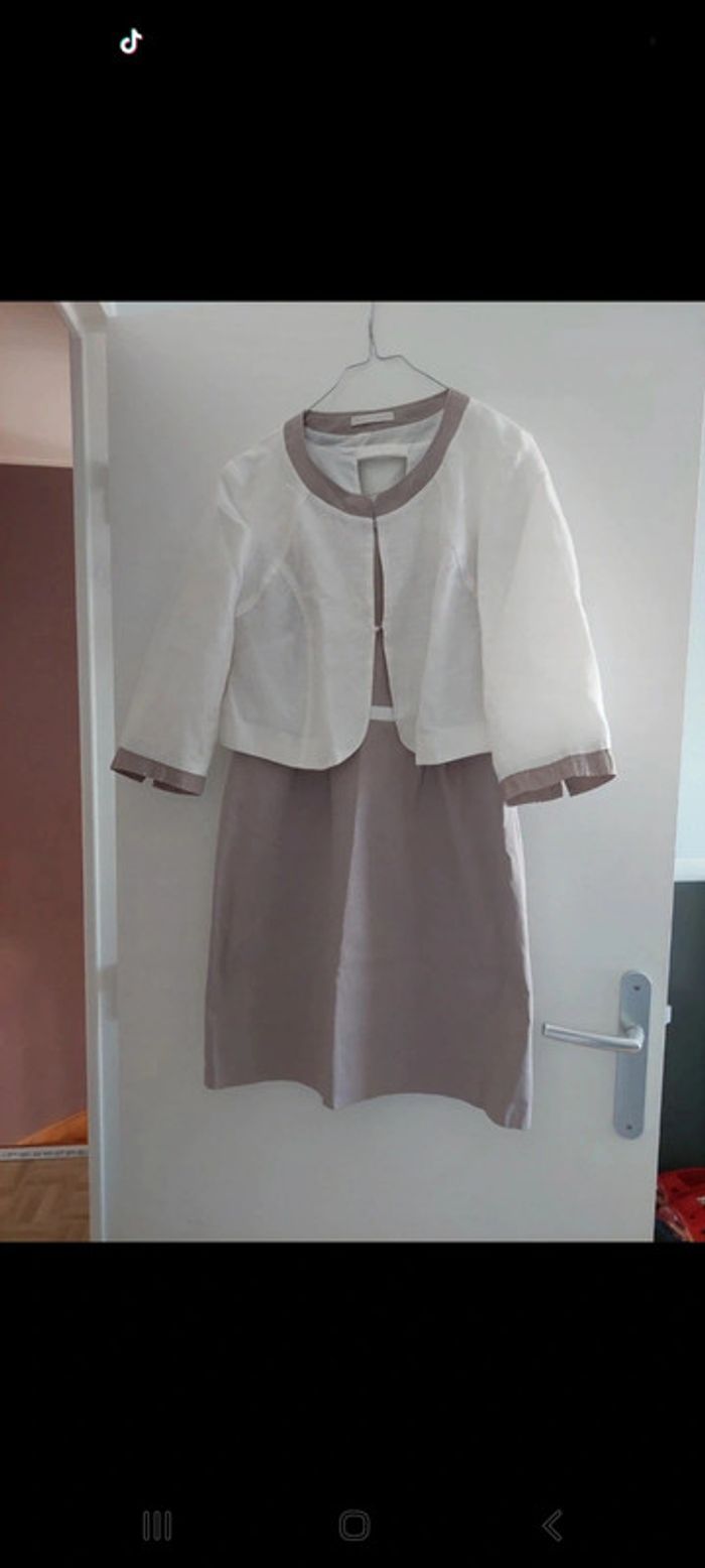 Robe sans manche doublée avec fermeture éclair invisible sur le côté. Coloris Taupe et écru. Ensemble neuf, jamais porté car se fut un cadeau et malheureusement pas à la bonne taille.