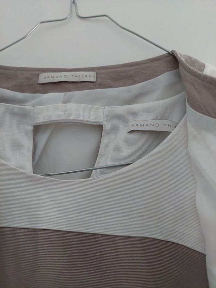 Robe sans manche doublée avec fermeture éclair invisible sur le côté. Coloris Taupe et écru Ensemble neuf, jamais porté car se fut un cadeau pas à la bonne taille. Ensemble pour cérémonie