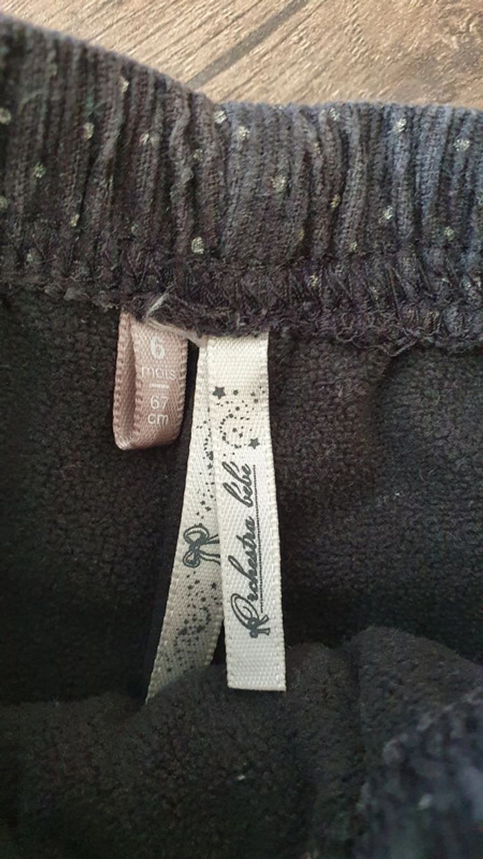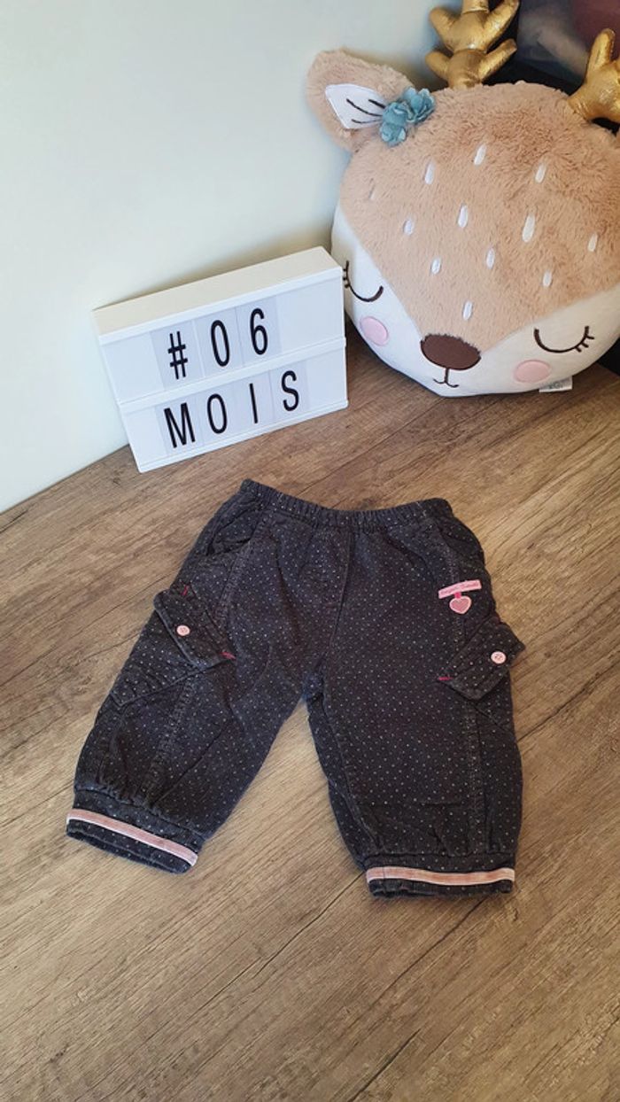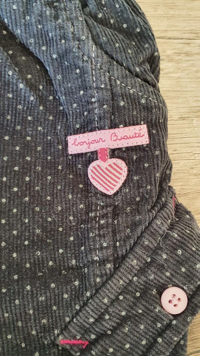 Joli pantalon en velours gris foncé avec des pois gris clairs, et des détails rose Taille 6 mois Marque Orchestra #manou30340_bébé6mois