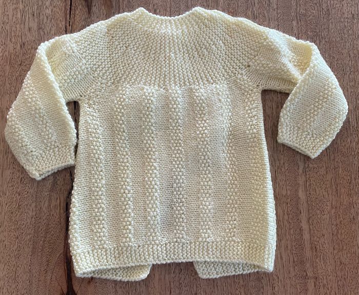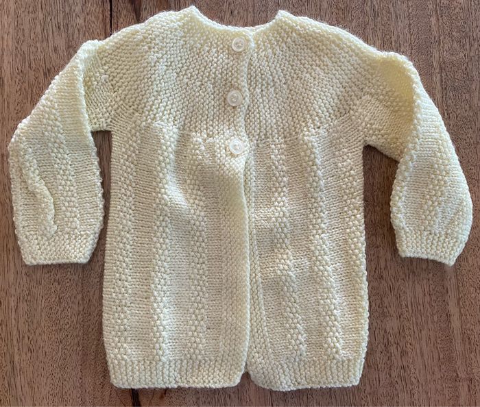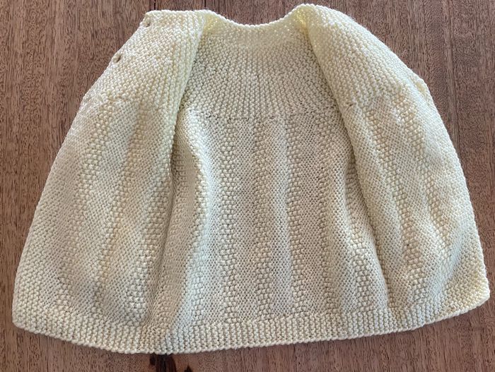 Gilet, jaune, tricoter. Sans taches En haut du gilet, trois petits boutons.