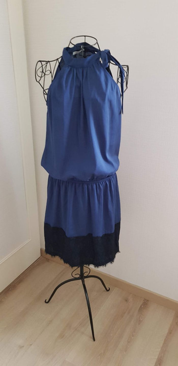 Robe bleu et noire marque Promod Taille 38 Col serré avec attache par noeud Détail dentelle en bas Portée 1 fois