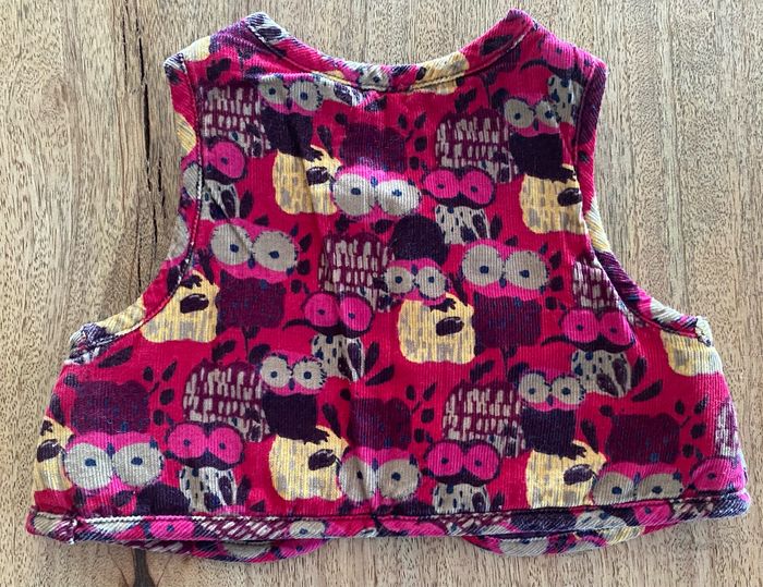 Gilet sans manches avec de dessiner des petits hiboux. Sans tache Ce gilet s’attache à l’intérieur avec un bouton.
