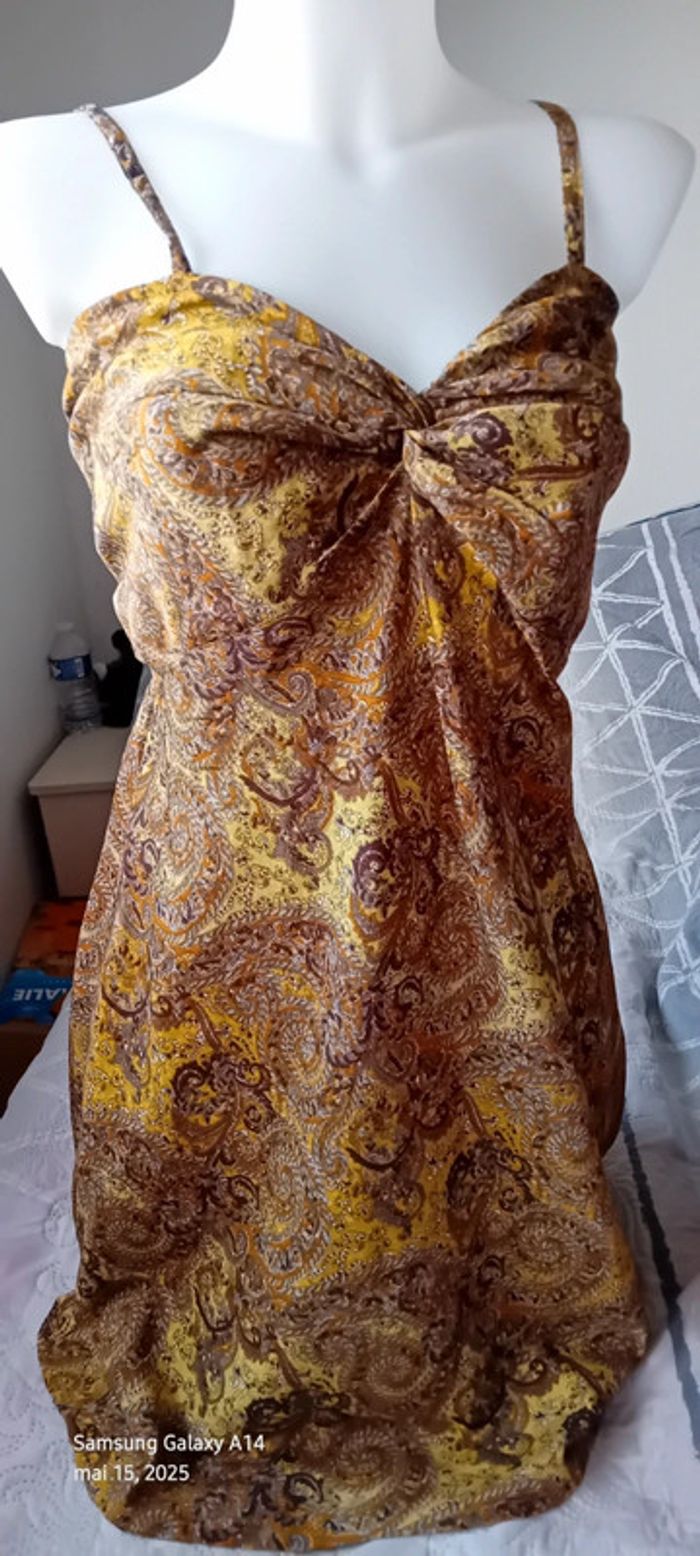 Robe courte en polyester aspect soie fines bretelles réglables taille haute élastique smock au dos motif arabesques inspiration indienne couleur jaune doré longueur 90 cm largeur aisselles à aisselles 42 cm correspond à un petit M 38 peu portée en très bon état #midole #midolefemme #midolefemme38 #femme38 #robefemme38 #robeété #robefinesbretelles #motifindien #robemotifindien #doré #jaune #madeinindia