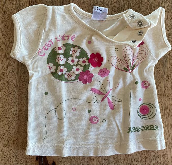 T-shirt crème, avec dessin sur le devant, du T-shirt » c’est l’été » Sans tache. Ouverture du T-shirt en haut à gauche sur l’épaule avec 2 pression. 100 % coton