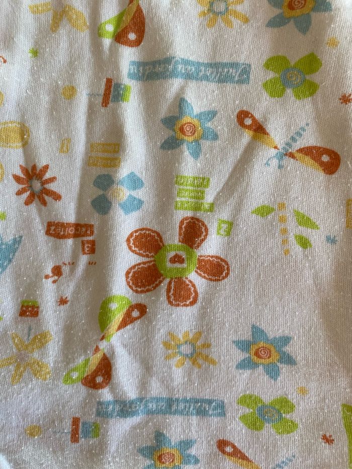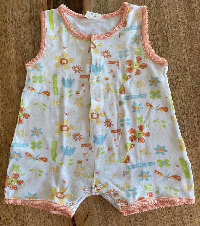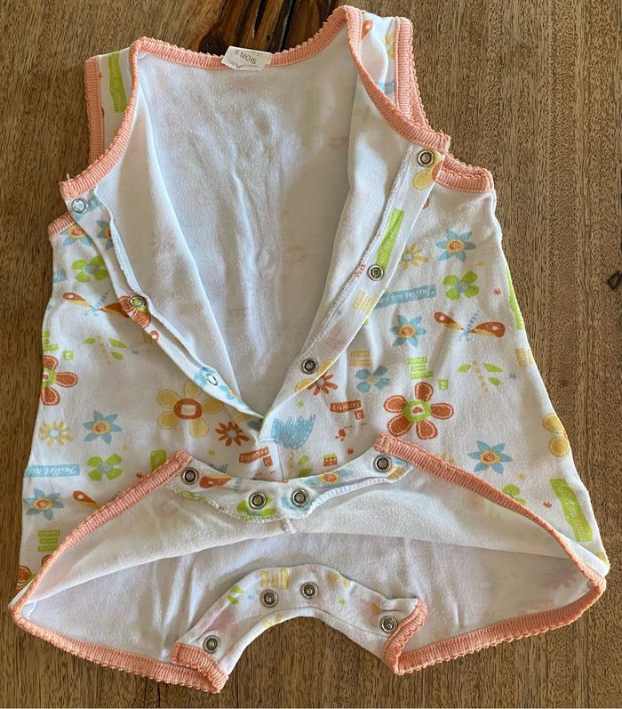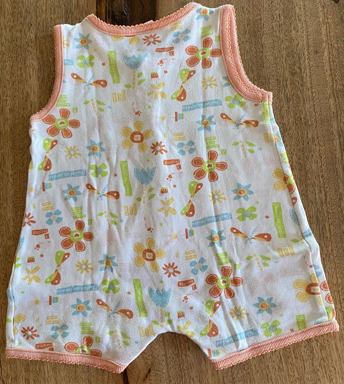 Body, short, sans manches, multicolore avec motif fleur, libellule, soleil, papillon. sans taches. 100 % coton Ouverture du body avec 3 pression par le devant. Ouverture entre les jambes avec 4 pressions