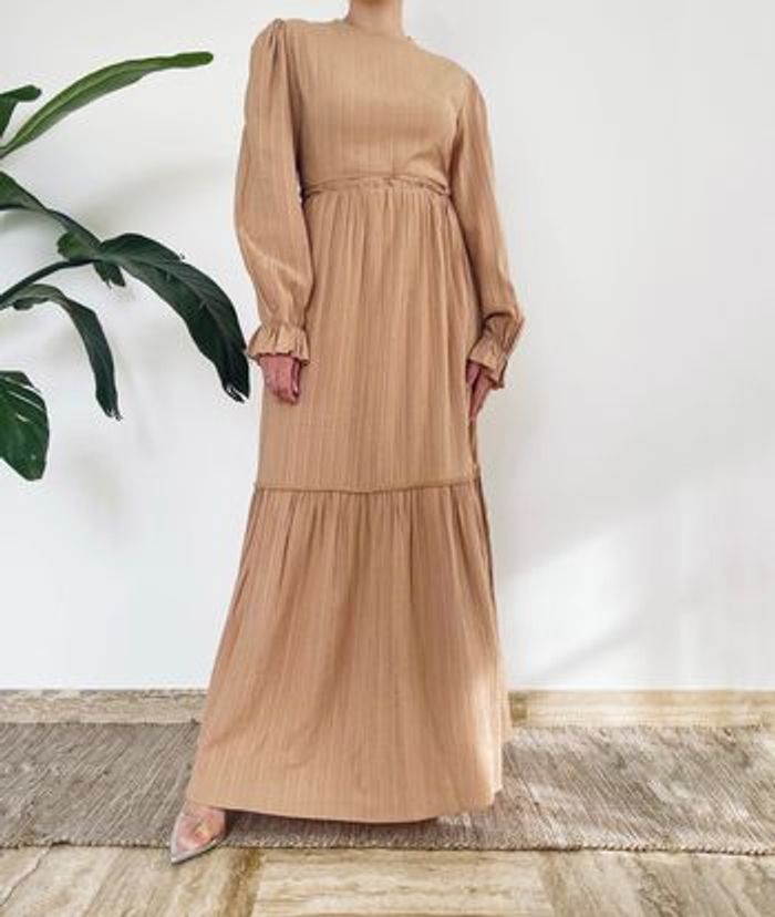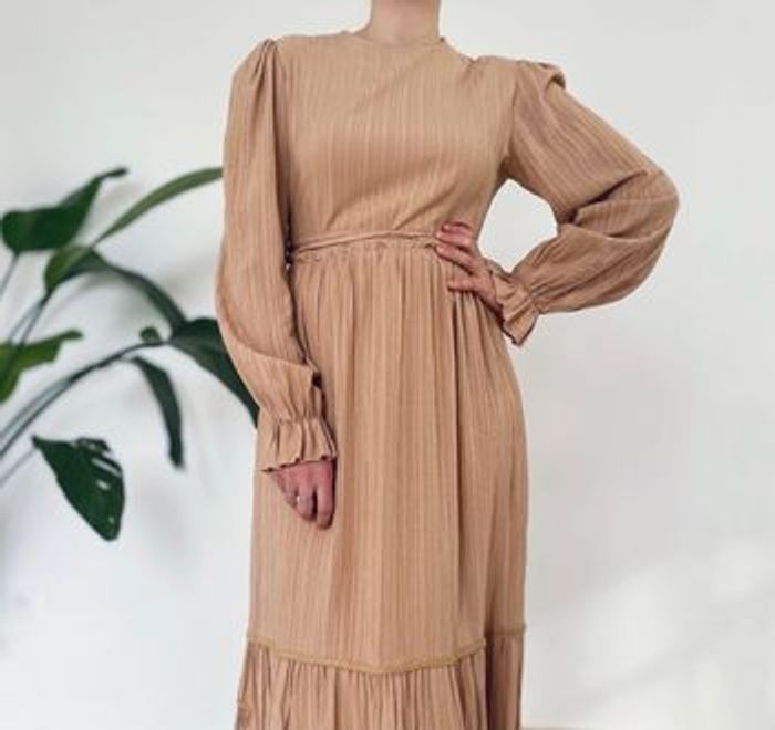 Très belle robe longue dans un ton beige nude, au tissu légèrement plissé, fluide et agréable à porter. Coupe droite avec taille légèrement marquée par un petit lien discret. Manches longues bouffantes avec finition froncée aux poignets. Le bas de la robe est subtilement volanté pour une allure élégante et féminine. Convient aussi bien pour une occasion que pour un look du quotidien stylé et confortable 📏Taille 42 👗 État neuve avec étiquette. 👠 Idéale avec des talons, des sandales ou des baskets pour un look plus décontracté.