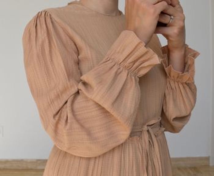 Très belle robe longue dans un ton beige nude, au tissu légèrement plissé, fluide et agréable à porter. Coupe droite avec taille légèrement marquée par un petit lien discret. Manches longues bouffantes avec finition froncée aux poignets. Le bas de la robe est subtilement volanté pour une allure élégante et féminine. Convient aussi bien pour une occasion que pour un look du quotidien stylé et confortable 📏Taille 36 👗 État neuve avec étiquette. 👠 Idéale avec des talons, des sandales ou des baskets pour un look plus décontracté.